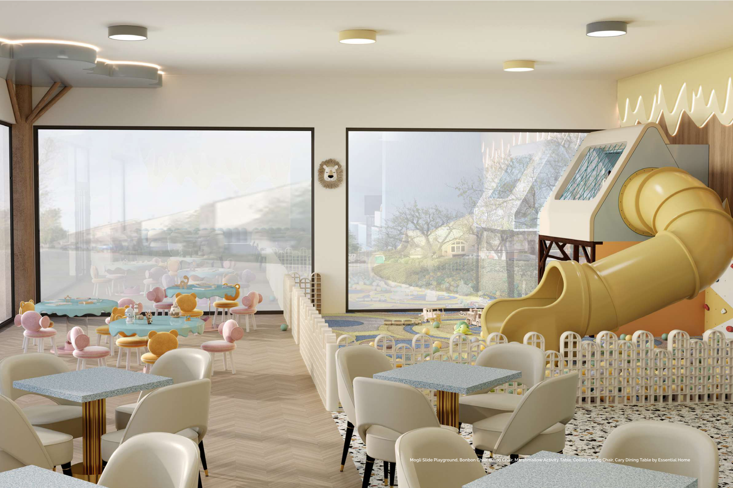 Mogli Slide Playground, Bonbon Chair, Baloo Chair, Marshmallow Activity Table, Collins Dining Chair, Cary Dining Table by Essential Home