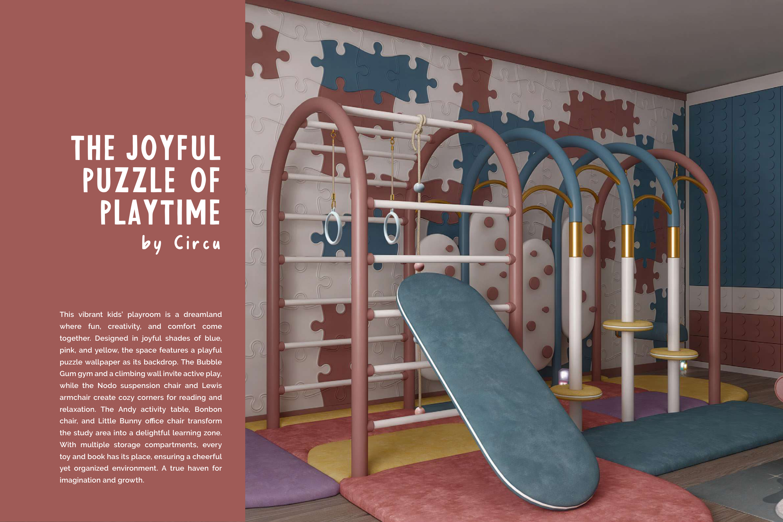 pink, and yellow, the space features a playful