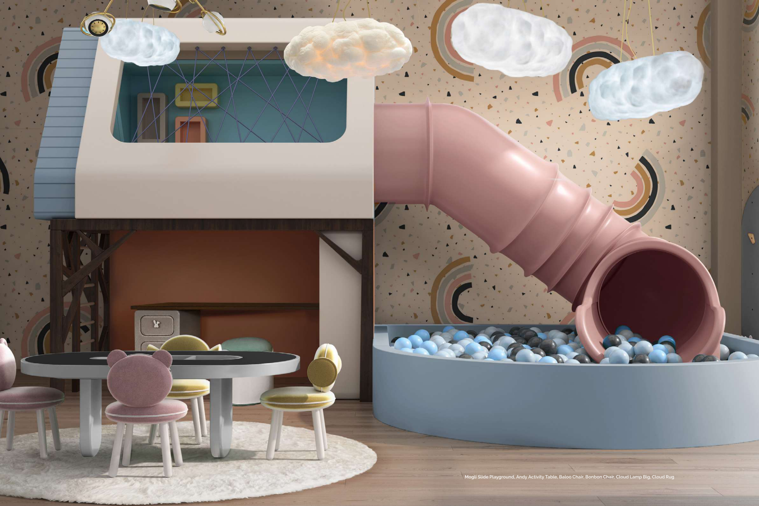 Mogli Slide Playground, Andy Activity Table, Baloo Chair, Bonbon Chair, Cloud Lamp Big, Cloud Rug