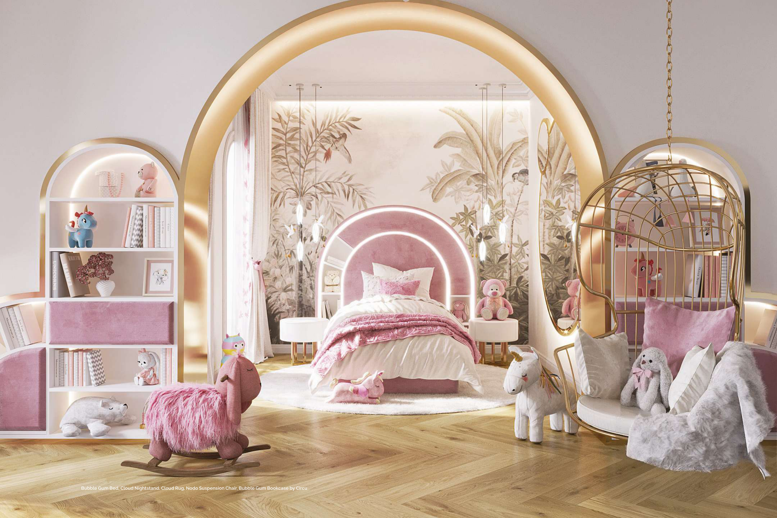 Bubble Gum Bed, Cloud Nightstand, Cloud Rug, Nodo Suspension Chair, Bubble Gum Bookcase by Circu