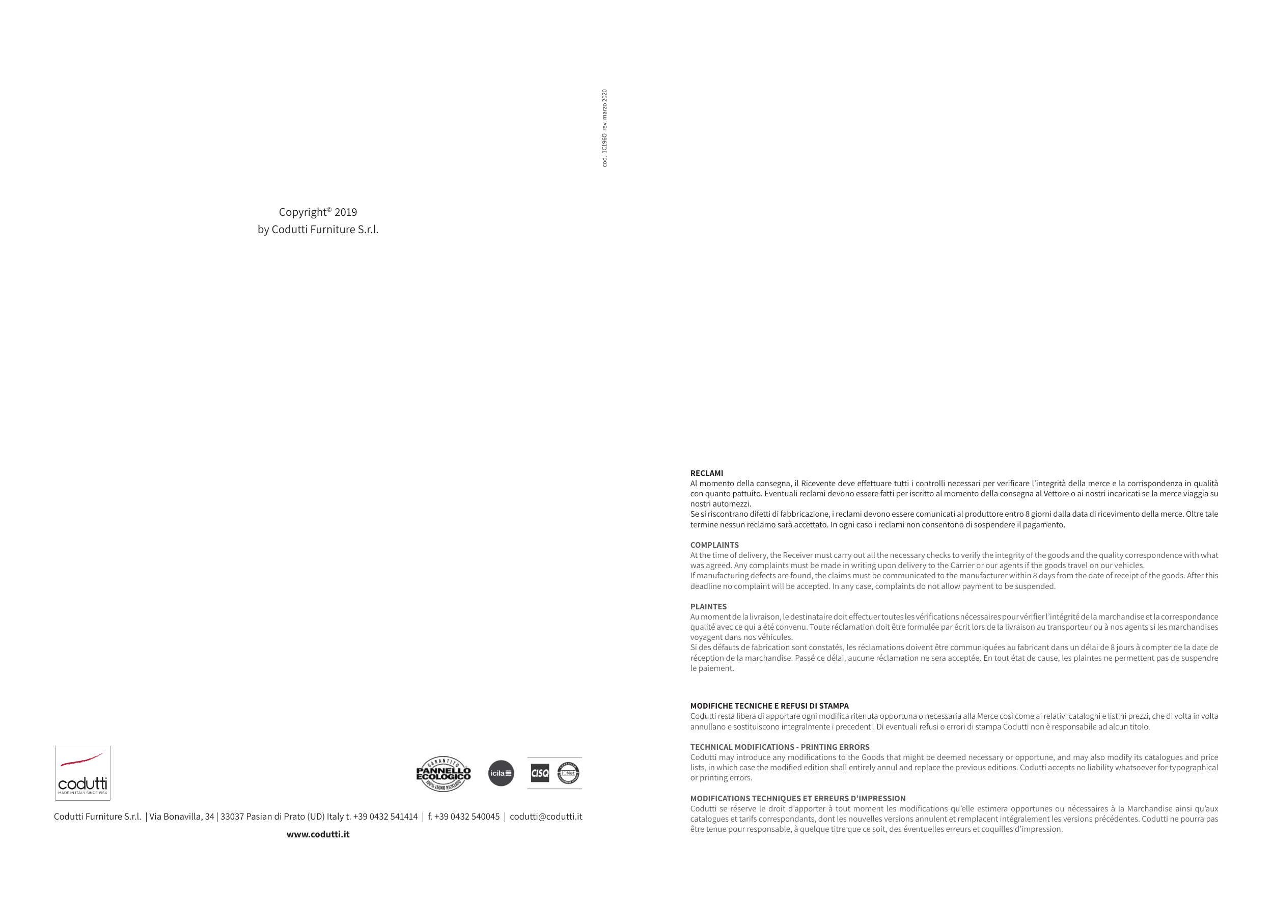 lists, in which case the modified edition shall entirely annul and replace the previous editions. Codutti accepts no liability whatsoever for typographical