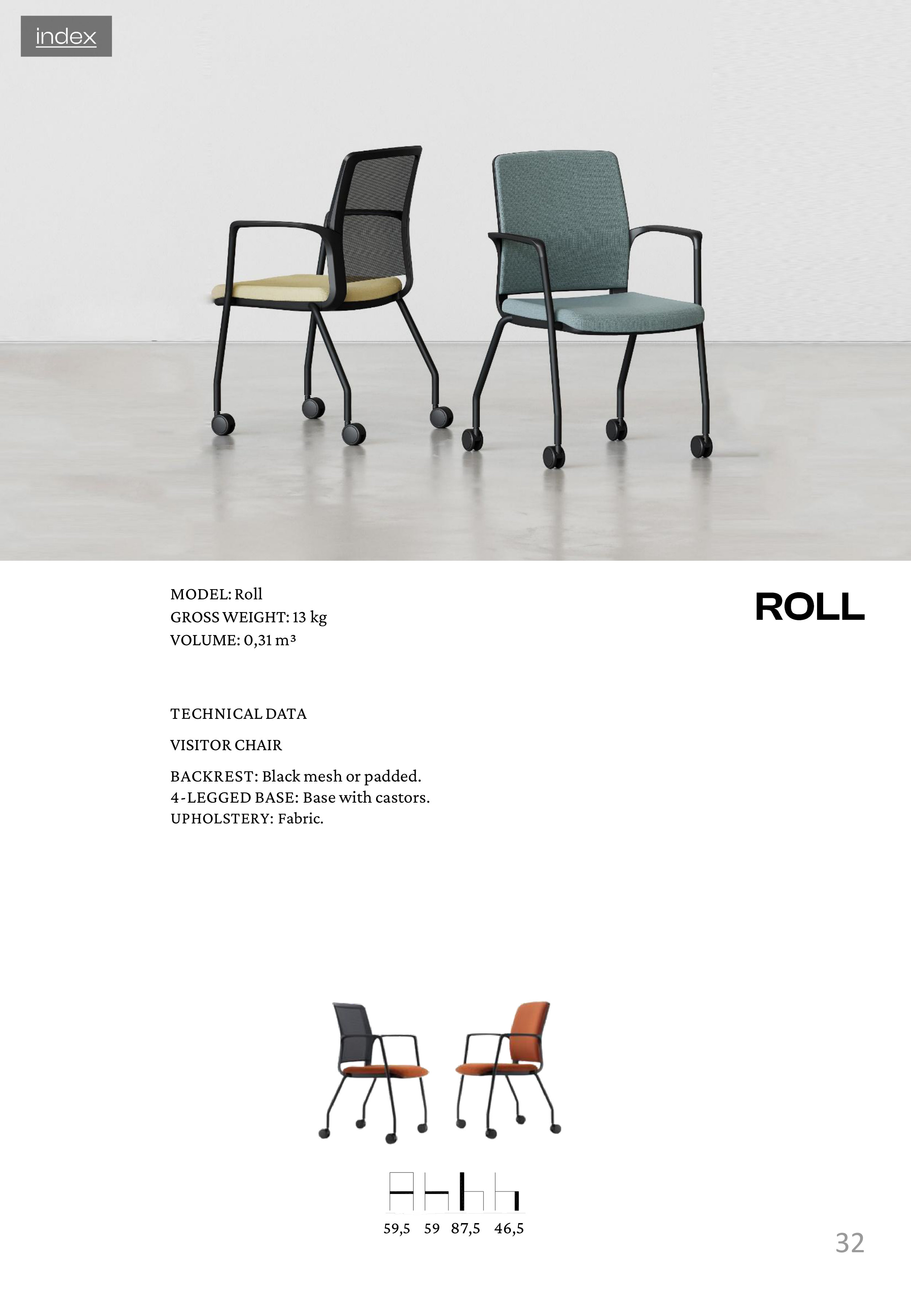 32 TECHNICAL DATA VISITOR CHAIR BACKREST: Black mesh or padded. 4-LEGGED BASE: Base with castors. UPHOLSTERY: Fabric. 59,5 59 87,5 46,5 MODEL: Roll GROSS WEIGHT: 13 kg VOLUME: 0,31 m³