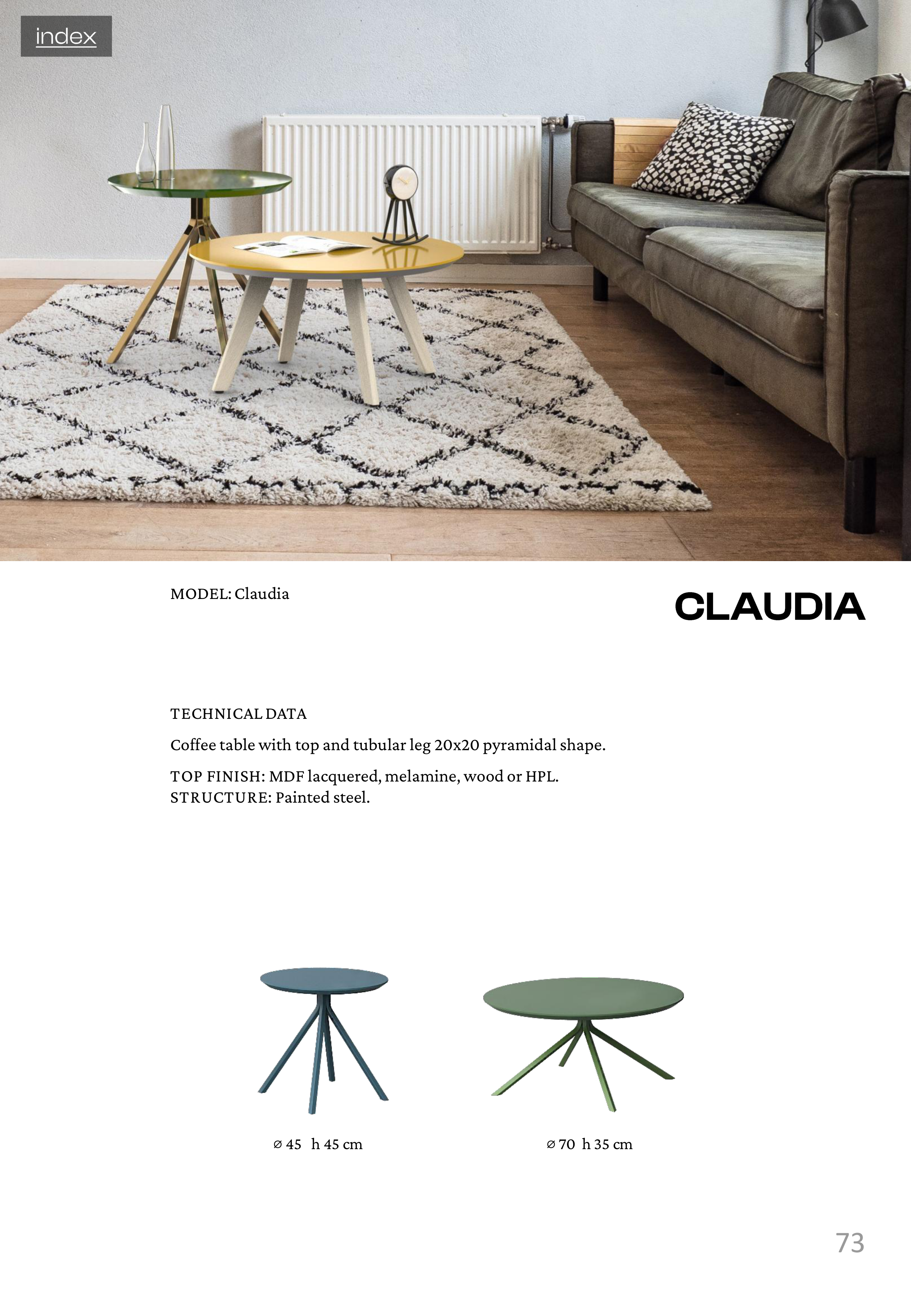 73 ⌀ 45 h 45 cm, ⌀ 70 h 35 cm TECHNICAL DATA Coffee table with top and tubular leg 20x20 pyramidal shape. TOP FINISH: MDF lacquered, melamine, wood or HPL. STRUCTURE: Painted steel. MODEL: Claudia