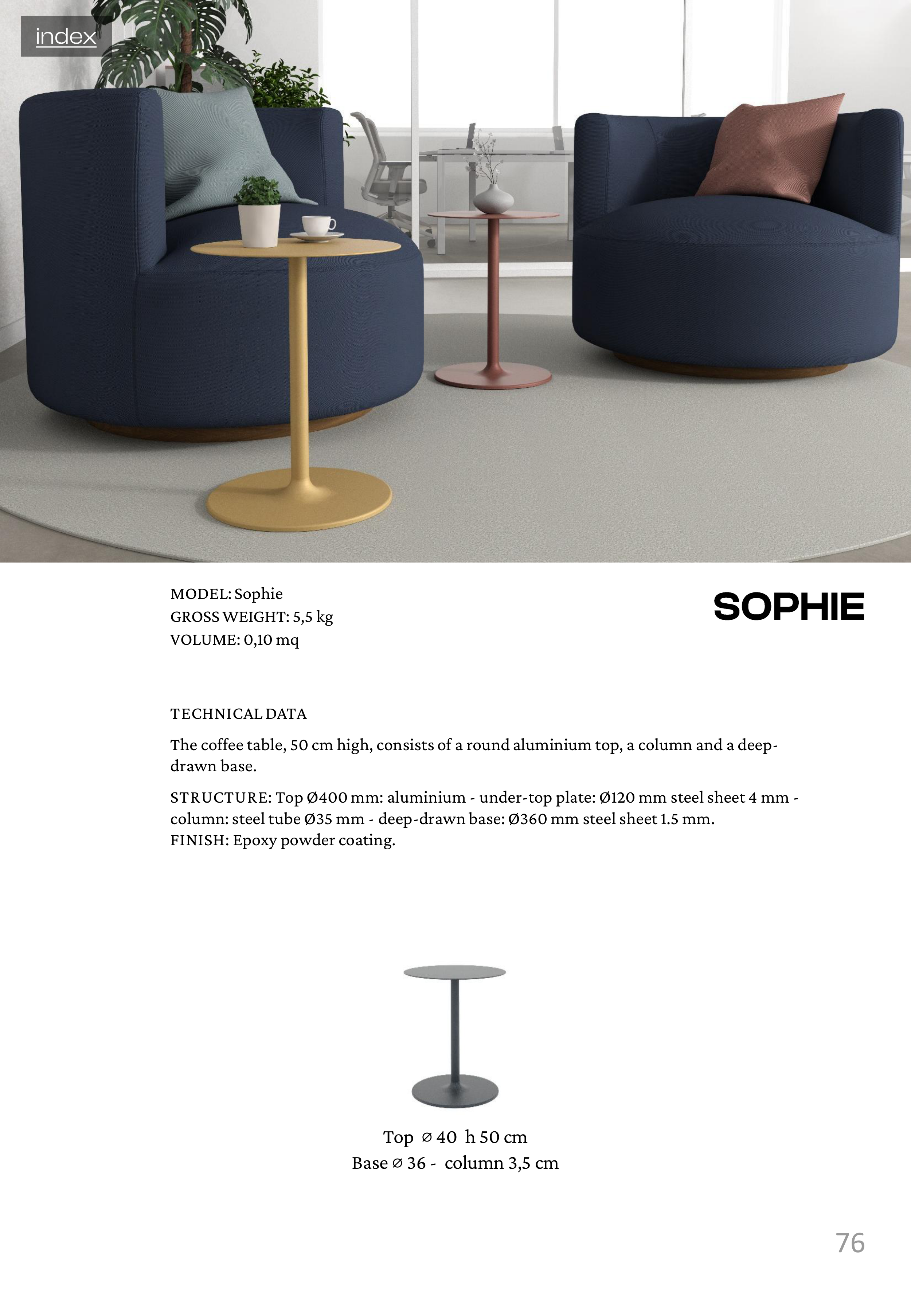 The coffee table, 50 cm high, consists of a round aluminium top, a column and a deep-