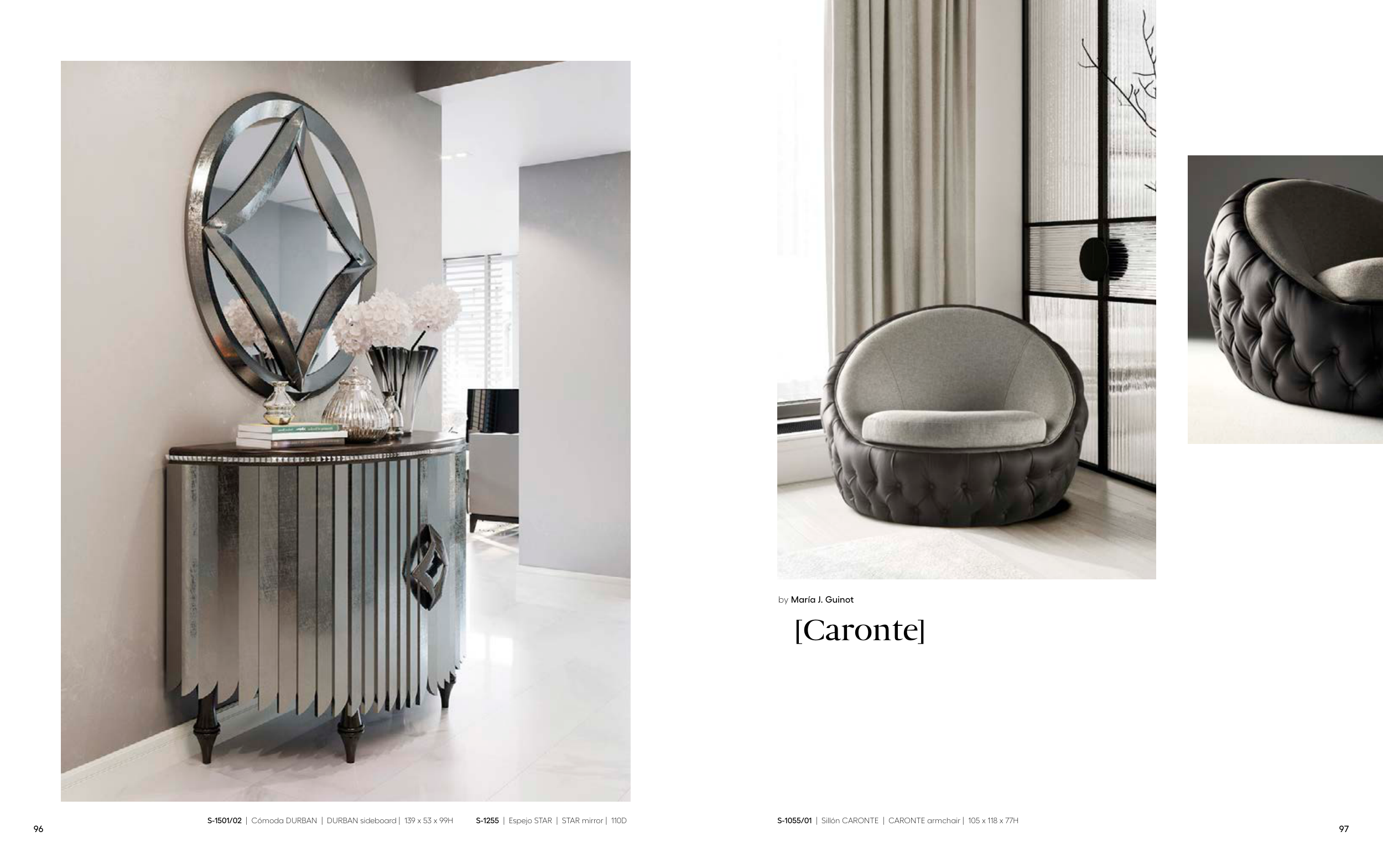 S-1055/01 | Sillón CARONTE | CARONTE armchair | 105 x 118 x 77H S-1501/02 | Cómoda DURBAN | DURBAN sideboard | 139 x 53 x 99H S-1255 | Espejo STAR | STAR mirror | 110D [Caronte] by María J. Guinot 96 97