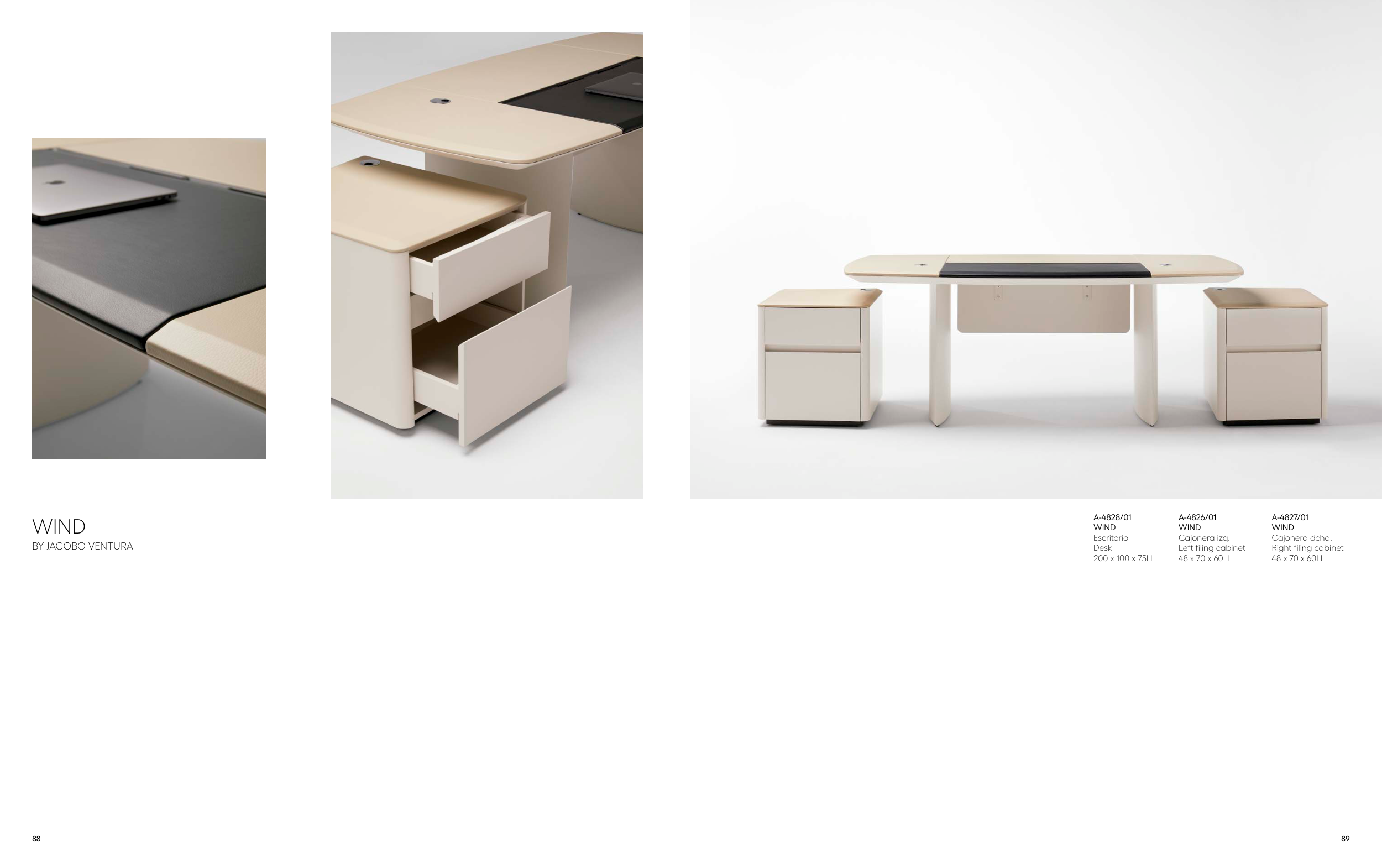 88 89 A-4826/01 WIND Cajonera izq. Left filing cabinet 48 x 70 x 60H A-4827/01 WIND Cajonera dcha. Right filing cabinet 48 x 70 x 60H A-4828/01 WIND Escritorio Desk 200 x 100 x 75H WIND BY JACOBO VENTURA