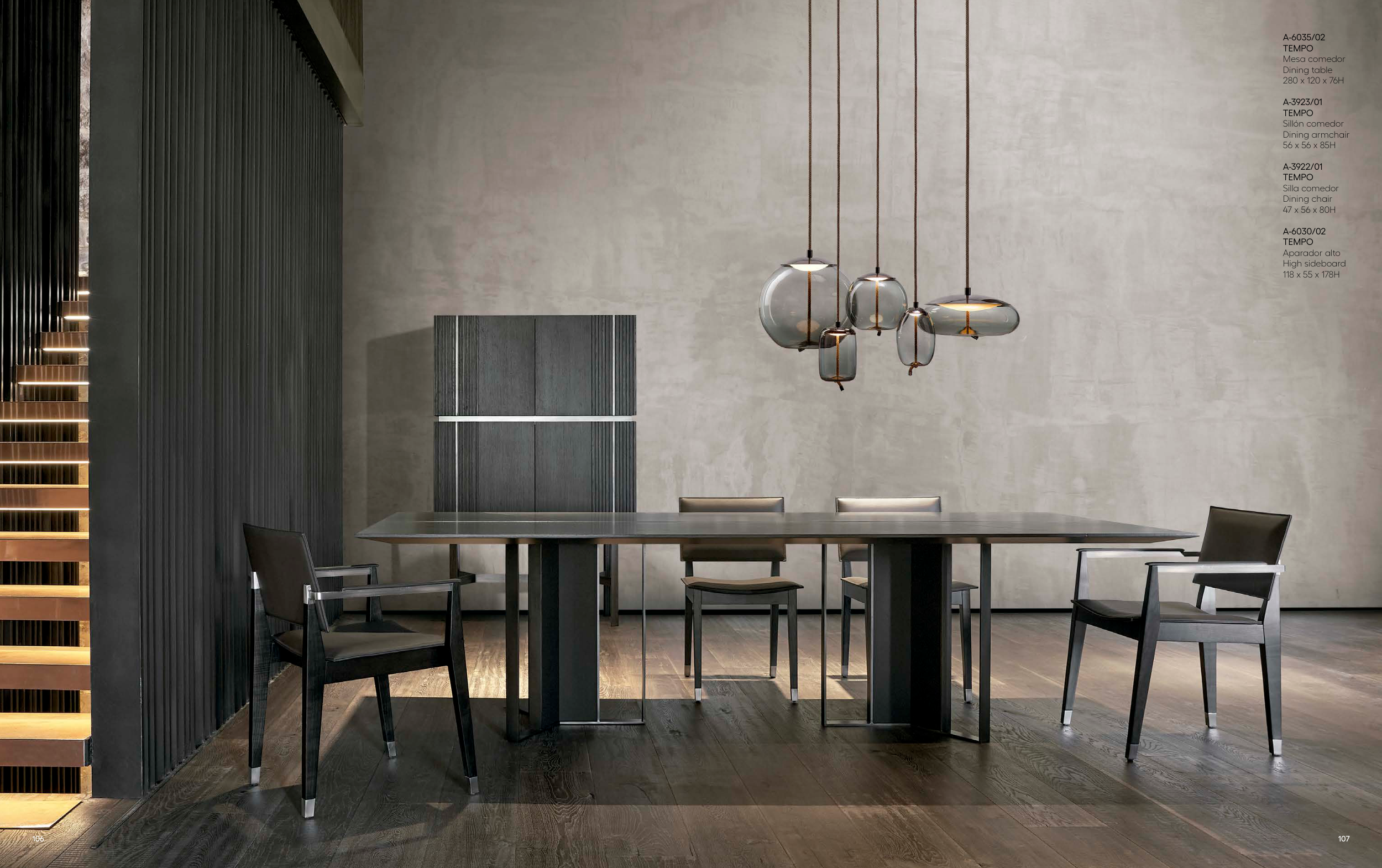 107 106 A-6035/02 TEMPO Mesa comedor Dining table 280 x 120 x 76H A-3923/01 TEMPO Sillón comedor Dining armchair 56 x 56 x 85H A-3922/01 TEMPO Silla comedor Dining chair 47 x 56 x 80H A-6030/02 TEMPO Aparador alto High sideboard 118 x 55 x 178H