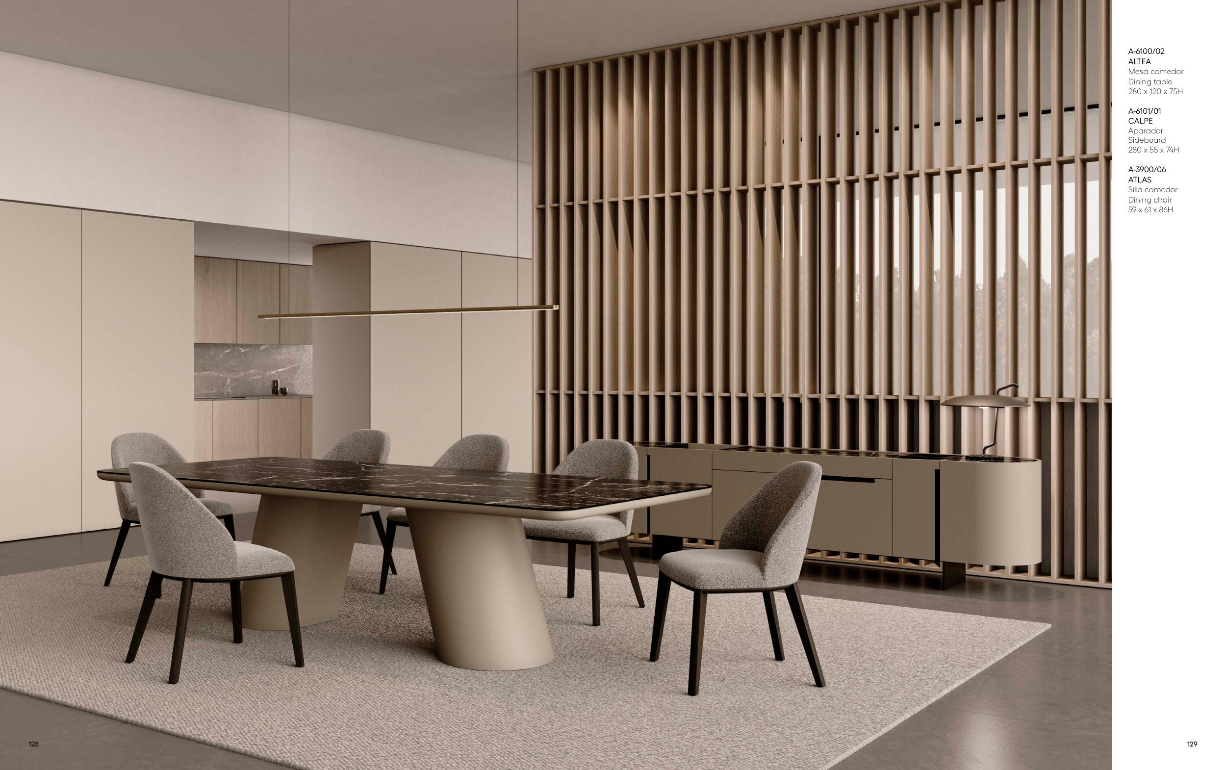 129 128 A-6100/02 ALTEA Mesa comedor Dining table 280 x 120 x 75H A-6101/01 CALPE Aparador Sideboard 280 x 55 x 74H A-3900/06 ATLAS Silla comedor Dining chair 59 x 61 x 86H