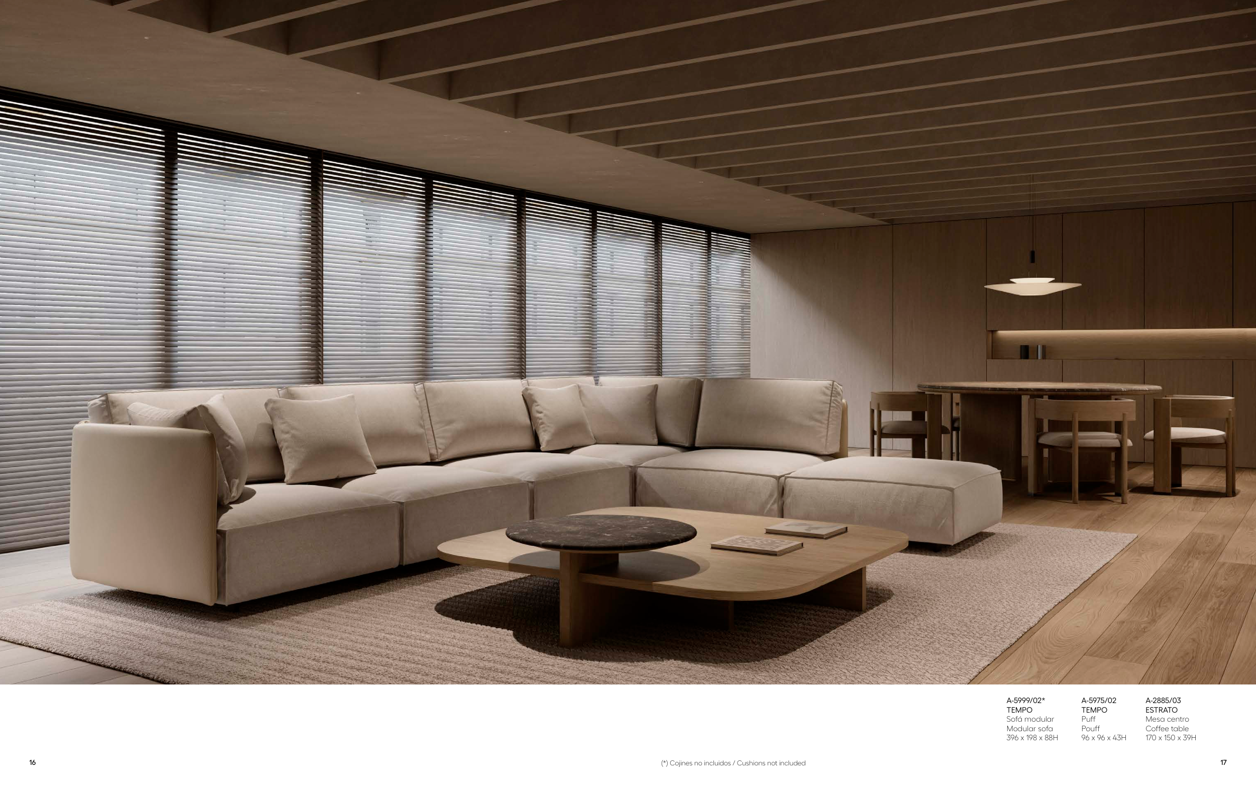 16 17 A-2885/03 ESTRATO Mesa centro Coffee table 170 x 150 x 39H A-5975/02 TEMPO Puff Pouff 96 x 96 x 43H A-5999/02* TEMPO Sofá modular Modular sofa 396 x 198 x 88H (*) Cojines no incluidos / Cushions not included