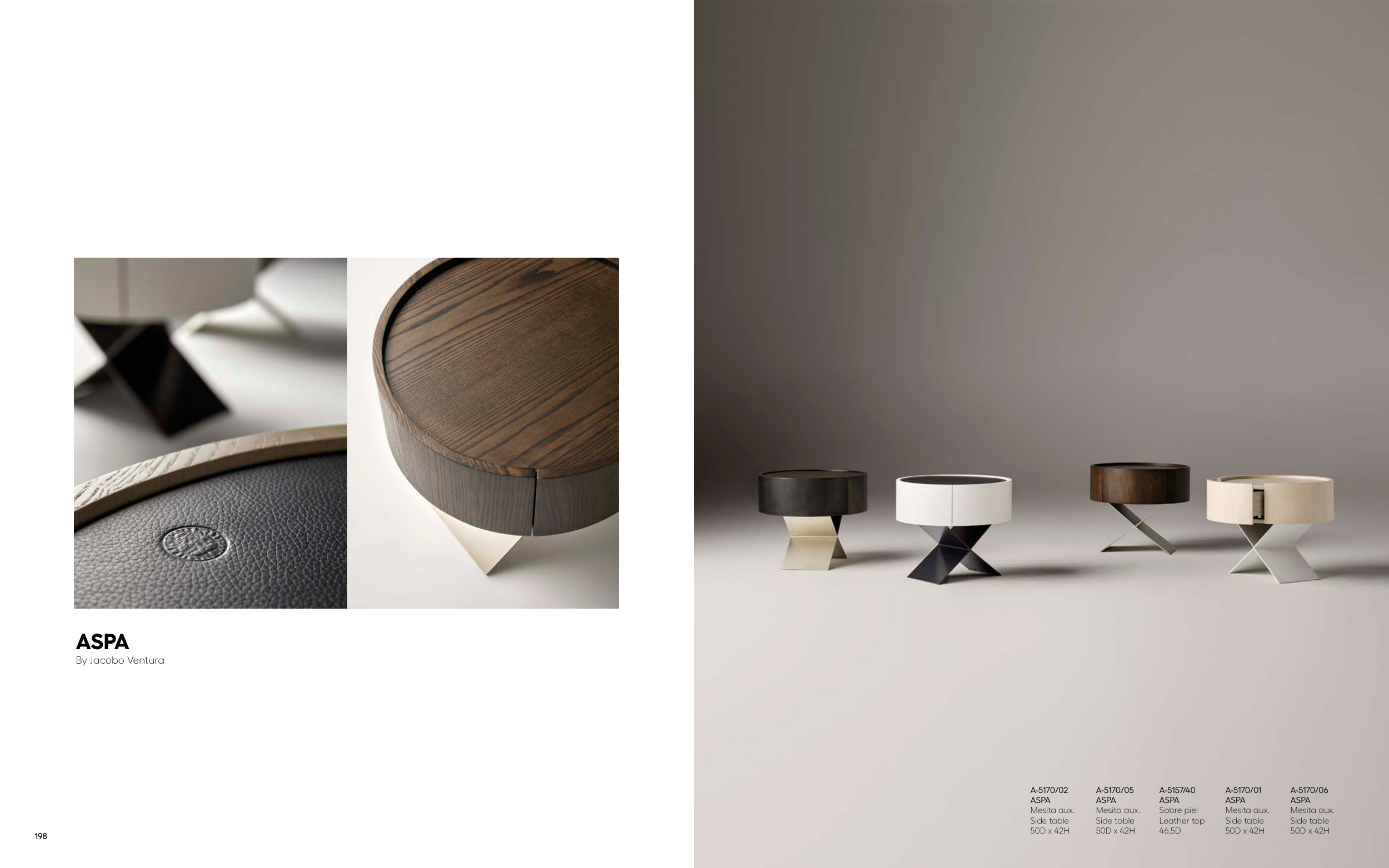 A-5170/02 ASPA Mesita aux. Side table 50D x 42H A-5170/05 ASPA Mesita aux. Side table 50D x 42H A-5157/40 ASPA Sobre piel Leather top 46,5D A-5170/01 ASPA Mesita aux. Side table 50D x 42H A-5170/06 ASPA Mesita aux. Side table 50D x 42H ASPA By Jacobo Ventura 198