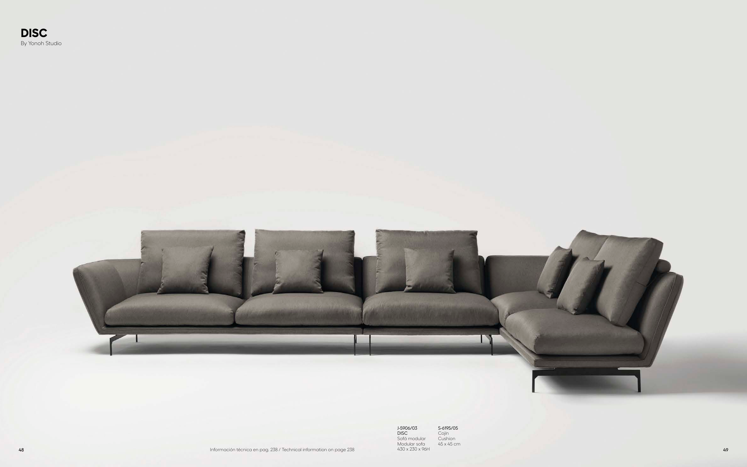 J-5906/03 DISC Sofá modular Modular sofa 430 x 230 x 96H S-6195/05 Cojín Cushion 45 x 45 cm Información técnica en pag. 238 / Technical information on page 238 DISC By Yonoh Studio 48 49