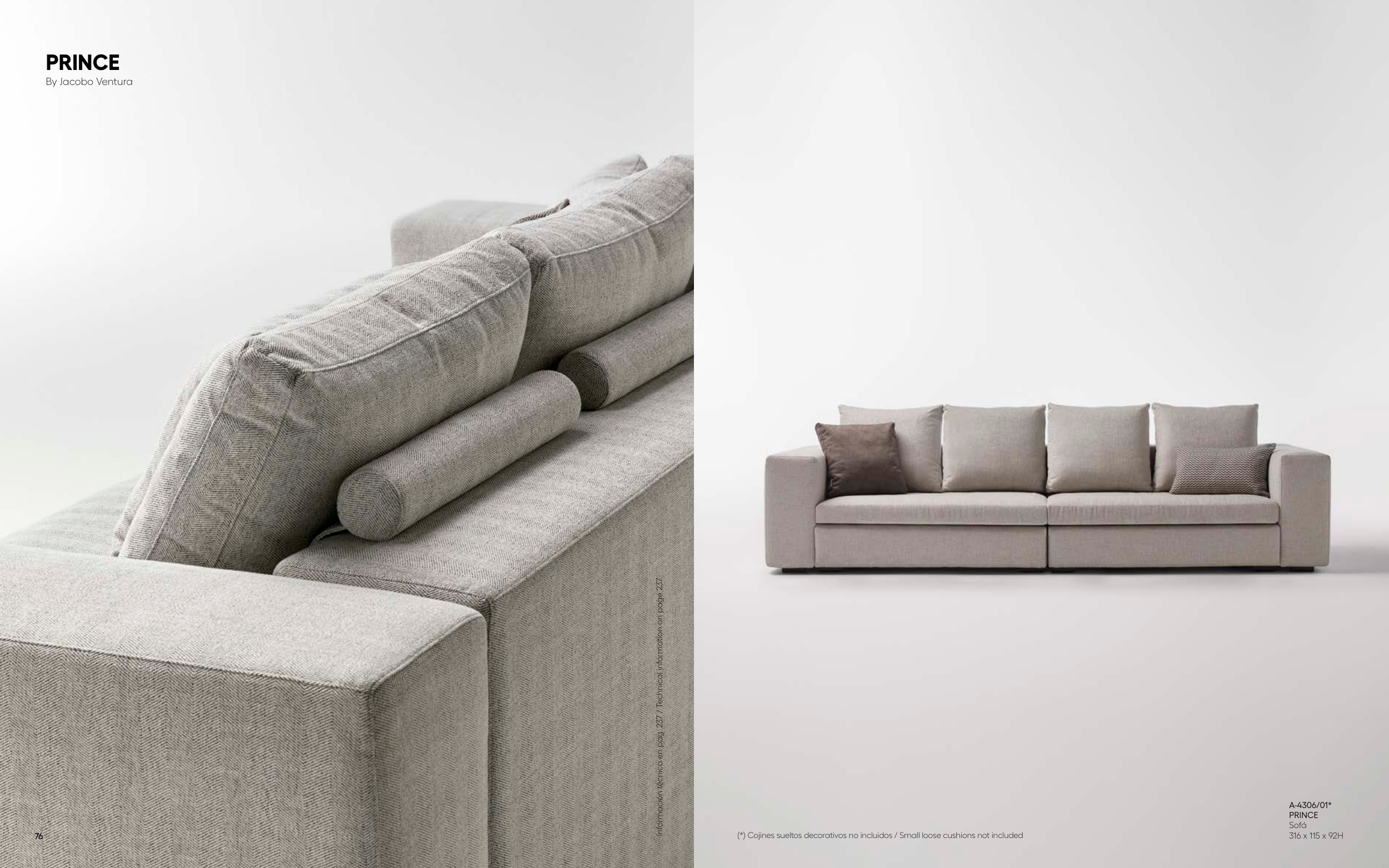 A-4306/01* PRINCE Sofá 316 x 115 x 92H (*) Cojines sueltos decorativos no incluidos / Small loose cushions not included Información técnica en pag. 237 / Technical information on page 237 PRINCE By Jacobo Ventura 76