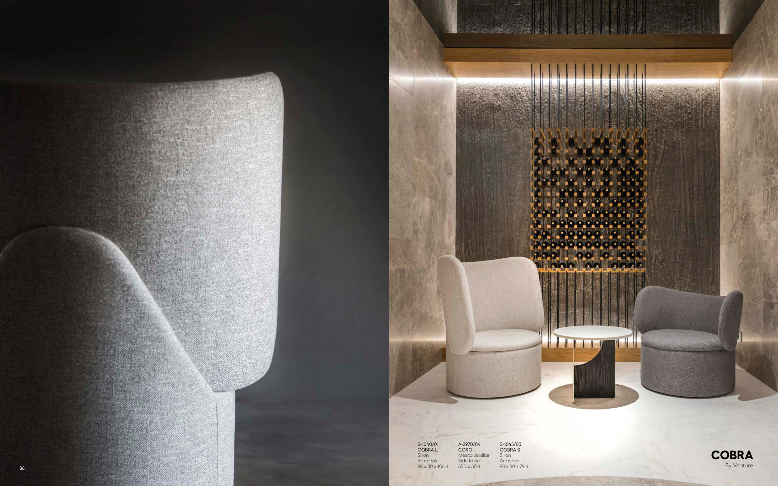 86 S-1040/01 COBRA L Sillón Armchair 98 x 80 x 106H A-2970/04 CORO Mesita auxiliar Side table 55D x 50H S-1045/03 COBRA S Sillón Armchair 98 x 80 x 79H COBRA By Venture