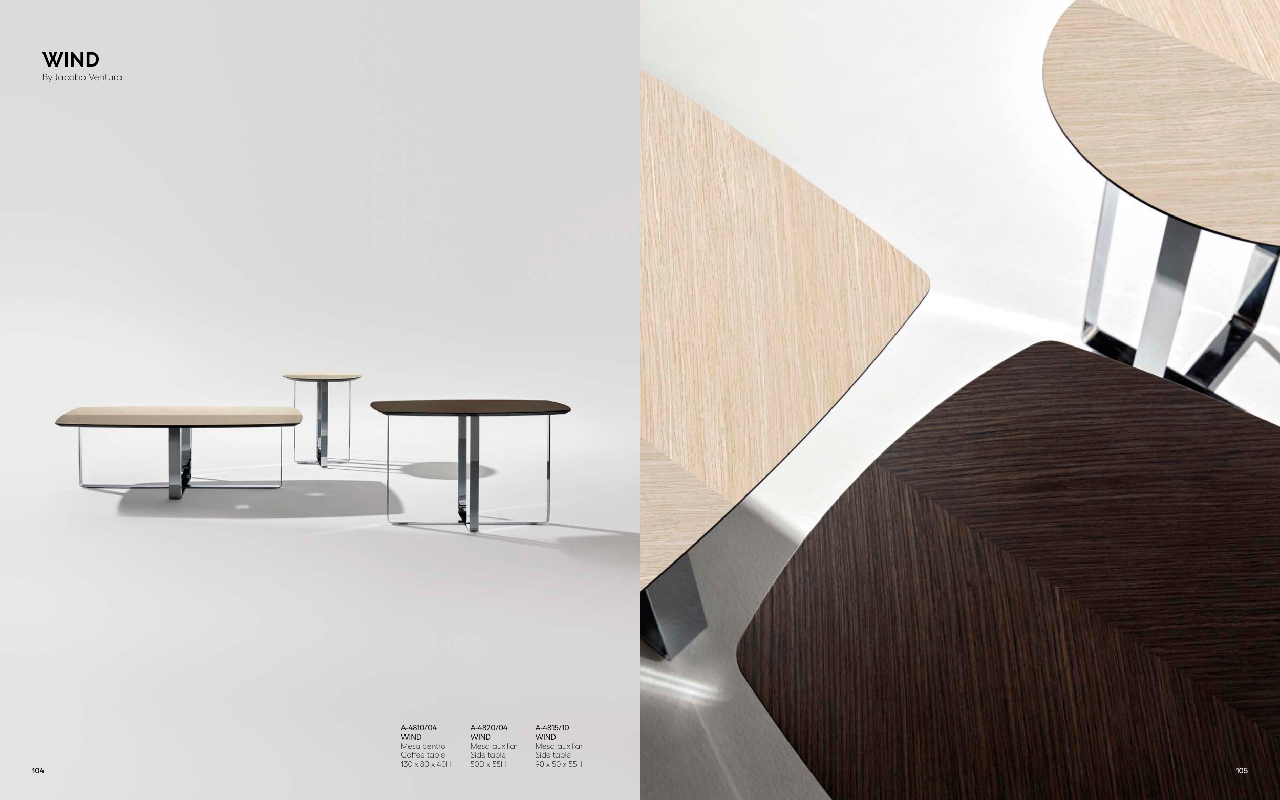 A-4810/04 WIND Mesa centro Coffee table 130 x 80 x 40H A-4815/10 WIND Mesa auxiliar Side table 90 x 50 x 55H A-4820/04 WIND Mesa auxiliar Side table 50D x 55H WIND By Jacobo Ventura 104 105