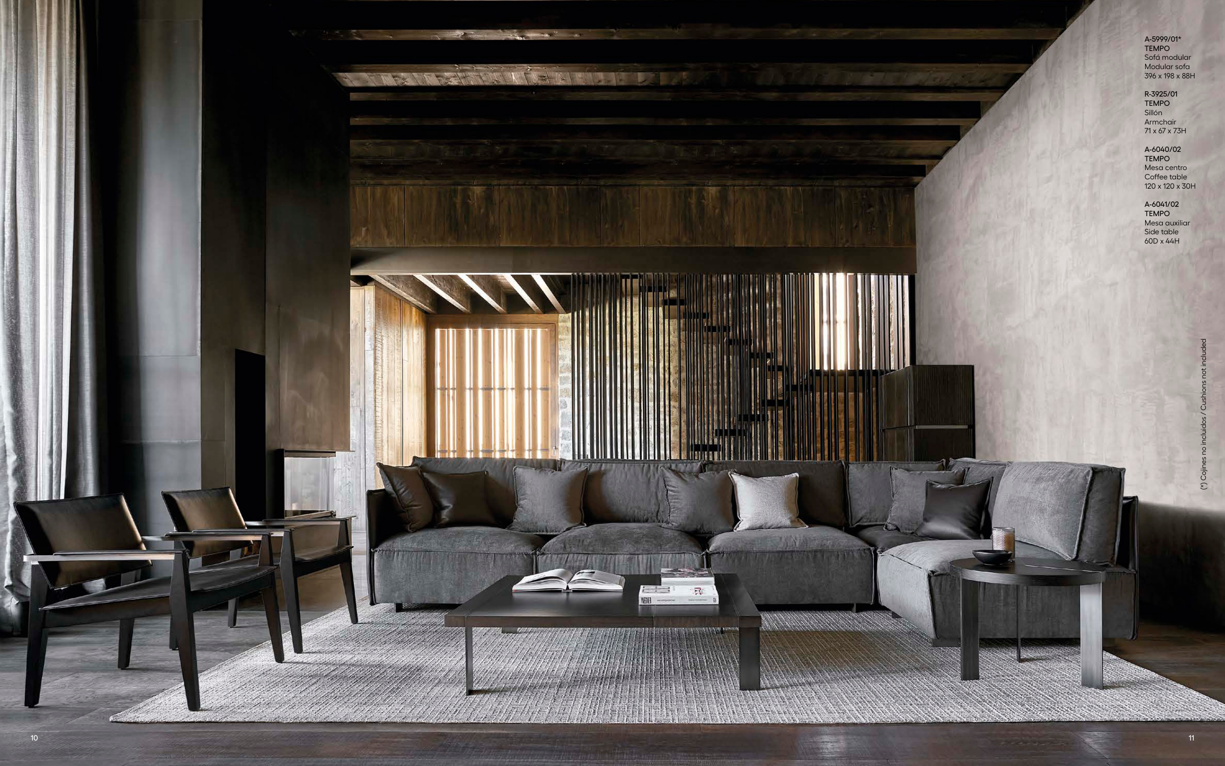 A-5999/01* TEMPO Sofá modular Modular sofa 396 x 198 x 88H R-3925/01 TEMPO Sillón Armchair 71 x 67 x 73H A-6040/02 TEMPO Mesa centro Coffee table 120 x 120 x 30H A-6041/02 TEMPO Mesa auxiliar Side table 60D x 44H (*) Cojines no incluidos / Cushions not included 10 11
