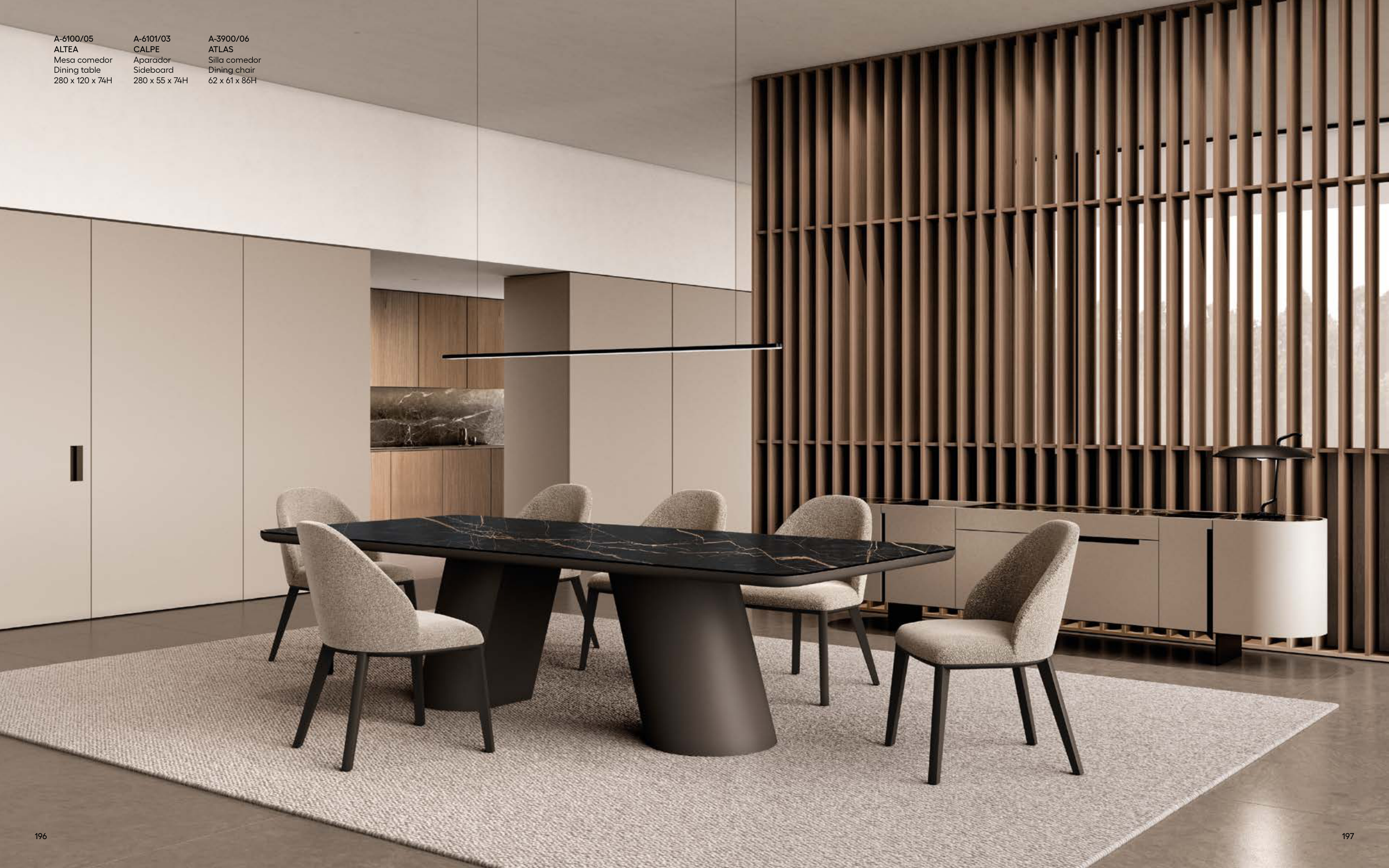 A-6100/05 ALTEA Mesa comedor Dining table 280 x 120 x 74H A-6101/03 CALPE Aparador Sideboard 280 x 55 x 74H A-3900/06 ATLAS Silla comedor Dining chair 62 x 61 x 86H 196 197