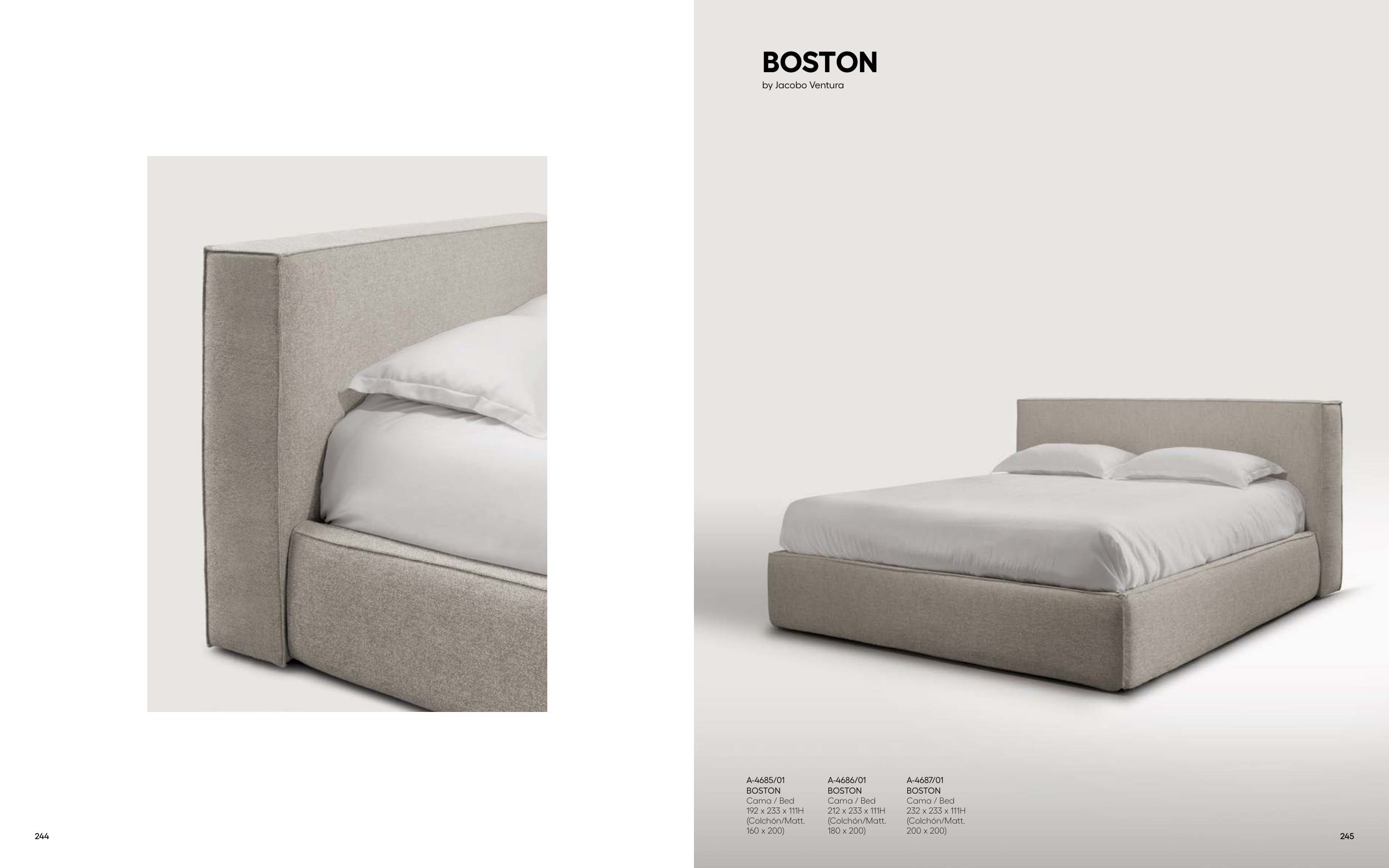 A-4685/01 BOSTON Cama / Bed 192 x 233 x 111H (Colchón/Matt. 160 x 200) A-4687/01 BOSTON Cama / Bed 232 x 233 x 111H (Colchón/Matt. 200 x 200) A-4686/01 BOSTON Cama / Bed 212 x 233 x 111H (Colchón/Matt. 180 x 200) BOSTON by Jacobo Ventura 244 245