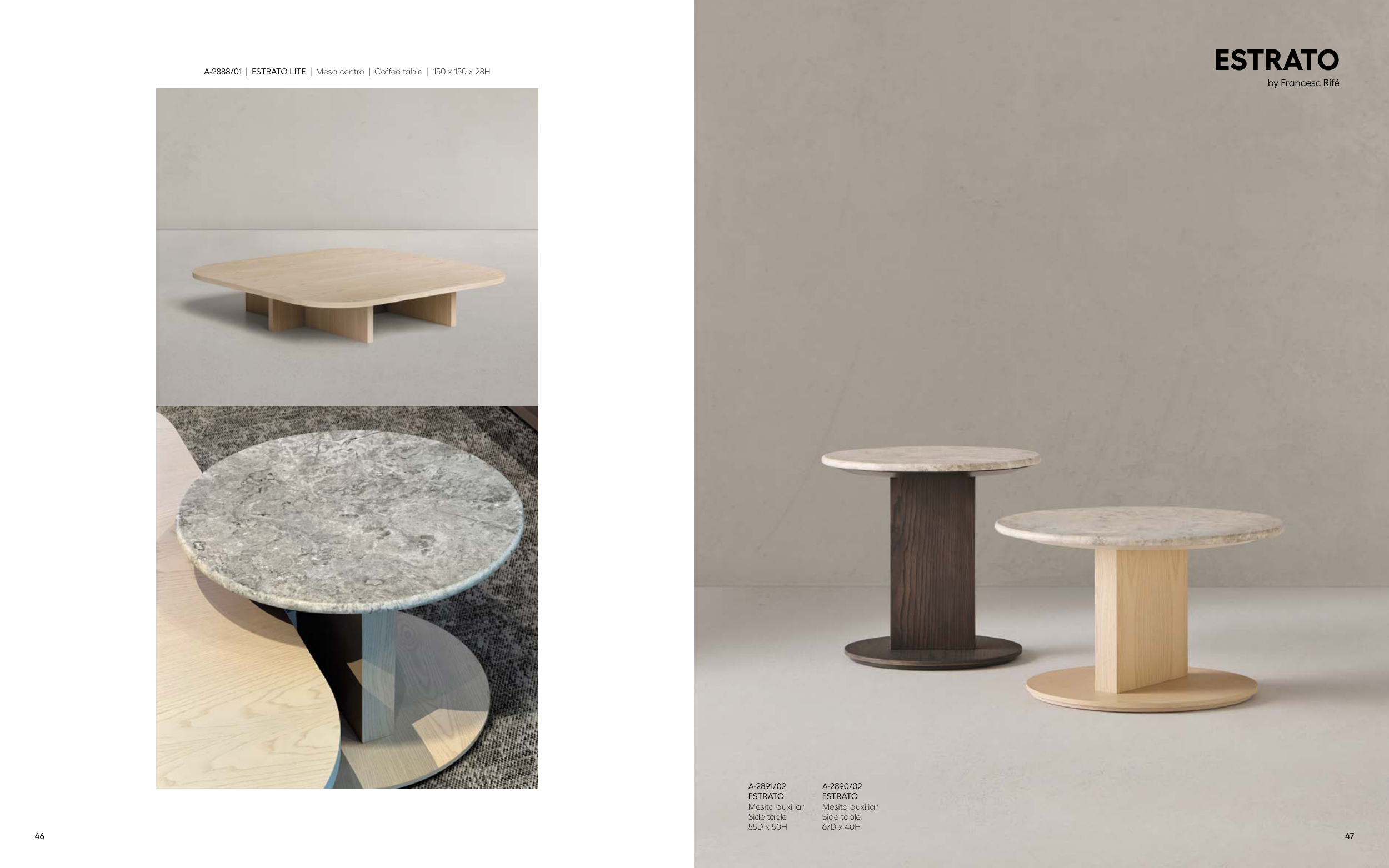A-2890/02 ESTRATO Mesita auxiliar Side table 67D x 40H A-2891/02 ESTRATO Mesita auxiliar Side table 55D x 50H A-2888/01 | ESTRATO LITE | Mesa centro | Coffee table | 150 x 150 x 28H ESTRATO by Francesc Rifé 46 47