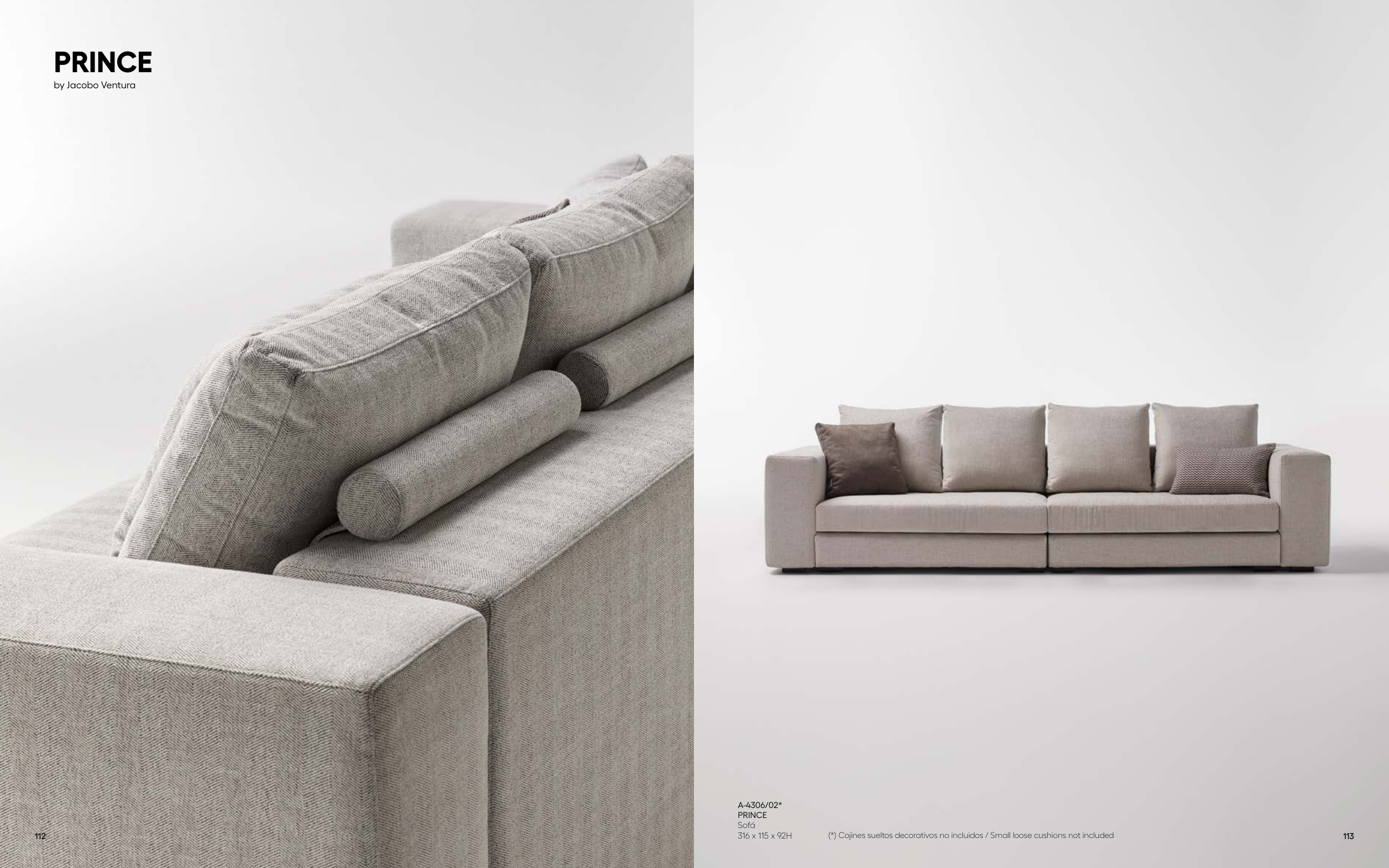 A-4306/02* PRINCE Sofá 316 x 115 x 92H (*) Cojines sueltos decorativos no incluidos / Small loose cushions not included PRINCE by Jacobo Ventura 112 113