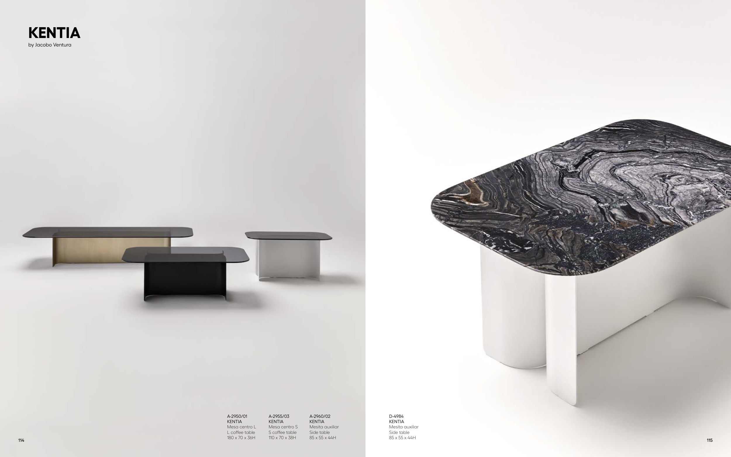D-4984 KENTIA Mesita auxiliar Side table 85 x 55 x 44H A-2960/02 KENTIA Mesita auxiliar Side table 85 x 55 x 44H A-2950/01 KENTIA Mesa centro L L coffee table 180 x 70 x 36H A-2955/03 KENTIA Mesa centro S S coffee table 110 x 70 x 38H KENTIA by Jacobo Ventura 114 115