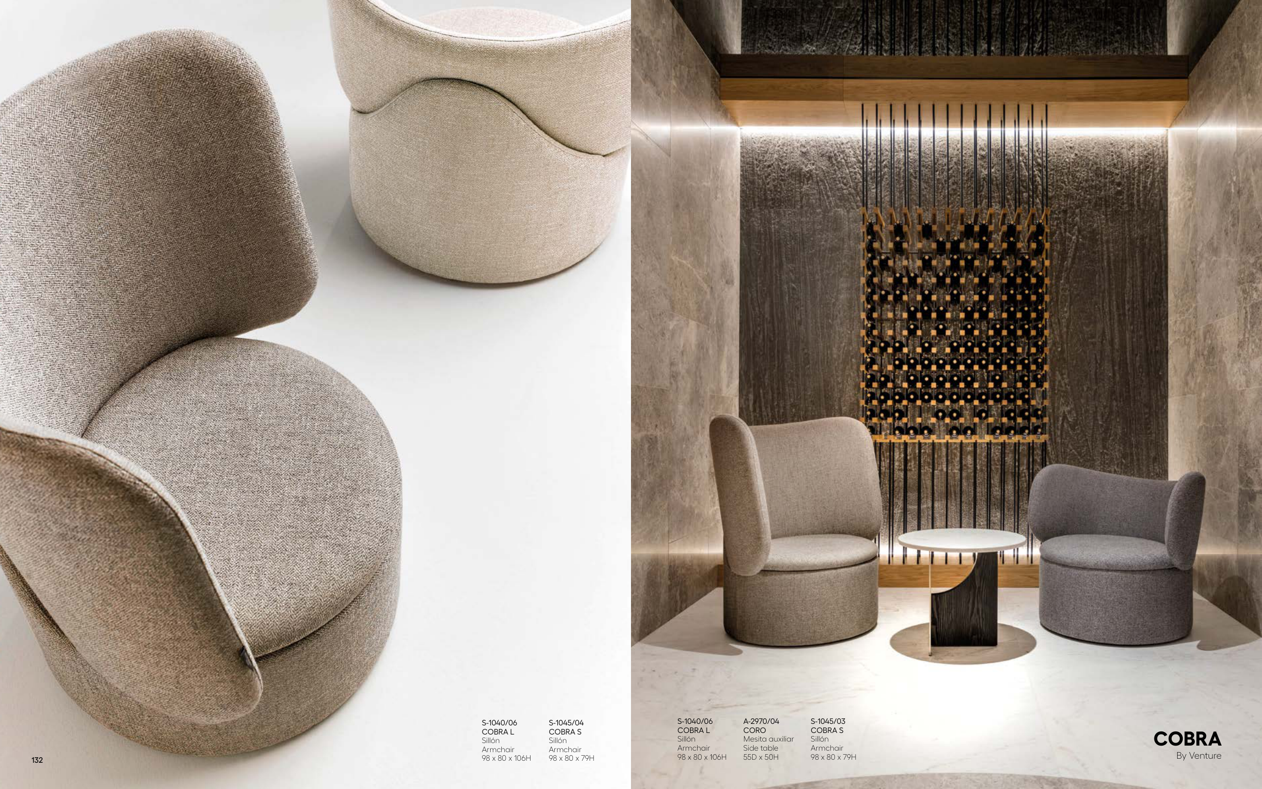 S-1040/06 COBRA L Sillón Armchair 98 x 80 x 106H A-2970/04 CORO Mesita auxiliar Side table 55D x 50H S-1045/03 COBRA S Sillón Armchair 98 x 80 x 79H COBRA By Venture S-1040/06 COBRA L Sillón Armchair 98 x 80 x 106H S-1045/04 COBRA S Sillón Armchair 98 x 80 x 79H 132