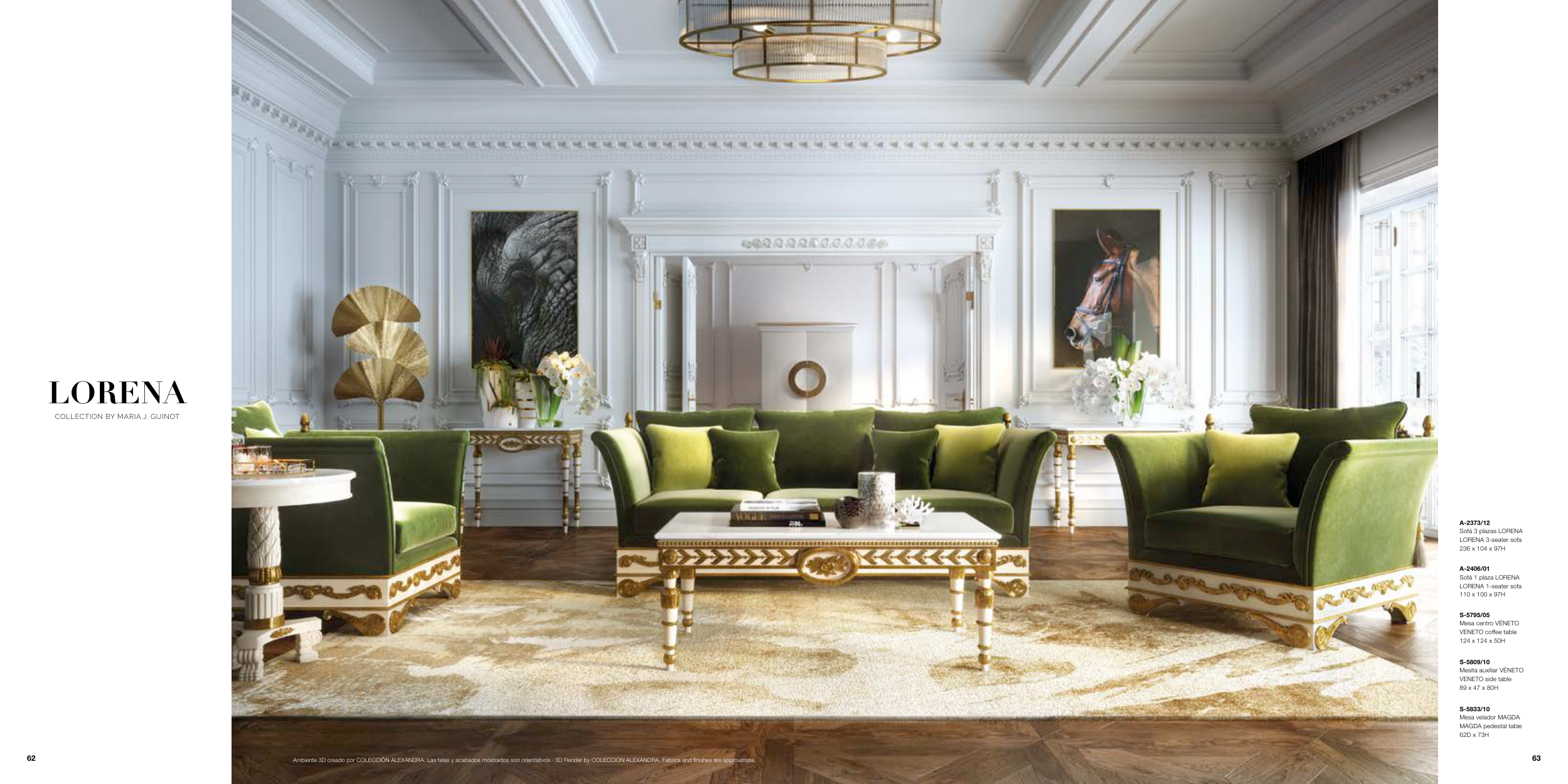 Ambiente 3D creado por COLECCIÓN ALEXANDRA. Las telas y acabados mostrados son orientativos · 3D Render by COLECCION ALEXANDRA. Fabrics and finishes are approximate.