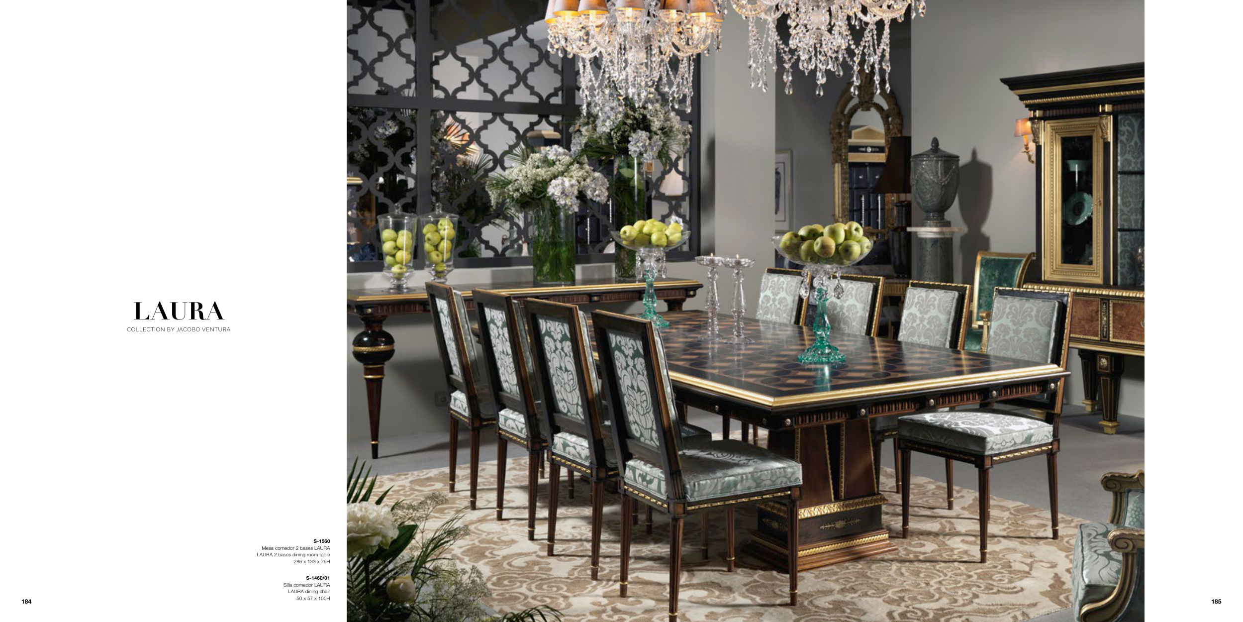 S-1560 Mesa comedor 2 bases LAURA LAURA 2 bases dining room table 286 x 133 x 76H S-1460/01 Silla comedor LAURA LAURA dining chair 50 x 57 x 100H LAURA COLLECTION BY JACOBO VENTURA 185 184