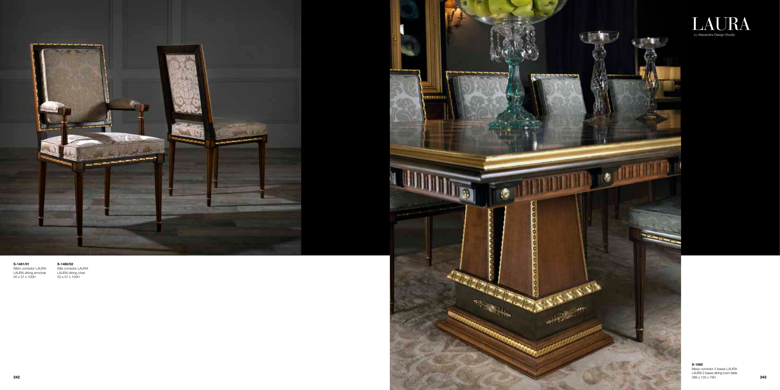 LAURA by Alexandra Design Studio S-1560 Mesa comedor 2 bases LAURA LAURA 2 bases dining room table 286 x 133 x 76H S-1461/01 Sillón comedor LAURA LAURA dining armchair 50 x 57 x 100H S-1460/02 Silla comedor LAURA LAURA dining chair 50 x 57 x 100H 243 242