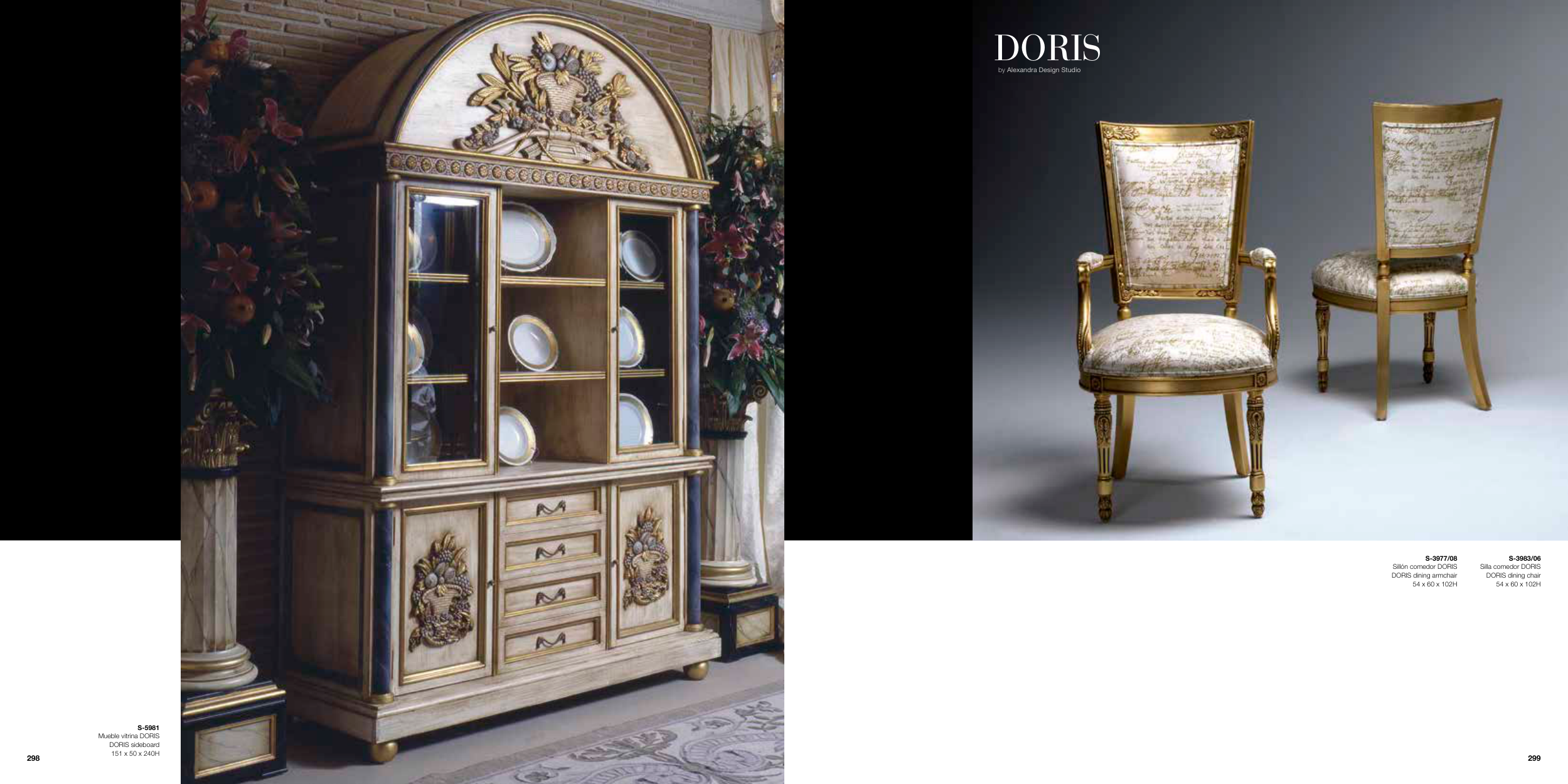 DORIS by Alexandra Design Studio S-5981 Mueble vitrina DORIS DORIS sideboard 151 x 50 x 240H S-3983/06 Silla comedor DORIS DORIS dining chair 54 x 60 x 102H S-3977/08 Sillón comedor DORIS DORIS dining armchair 54 x 60 x 102H 299 298