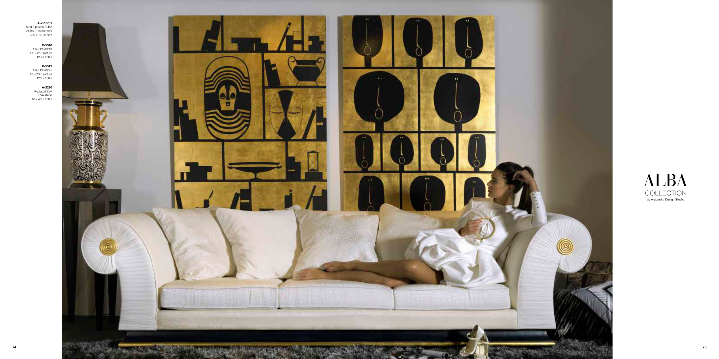ALBA by Alexandra Design Studio X-5519 Oleo DS-0225 DS-0225 picture 120 x 160H A-2220 Pedestal EVA EVA stand 40 x 40 x 100H X-5518 Oleo DS-0219 DS-0219 picture 120 x 160H A-2510/01 Sofá 3 plazas ALBA ALBA 3-seater sofa 320 x 120 x 82H 75 74