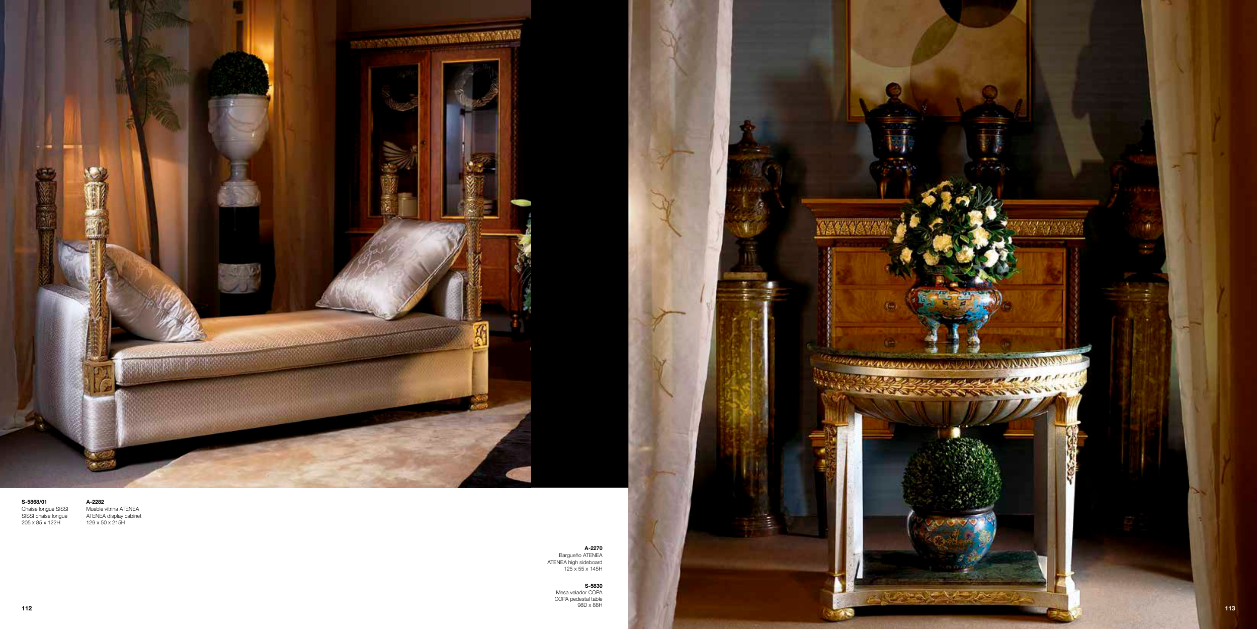 S-5830 Mesa velador COPA COPA pedestal table 98D x 88H S-5868/01 Chaise longue SISSI SISSI chaise longue 205 x 85 x 122H A-2270 Bargueño ATENEA ATENEA high sideboard 125 x 55 x 145H A-2282 Mueble vitrina ATENEA ATENEA display cabinet 129 x 50 x 215H 113 112