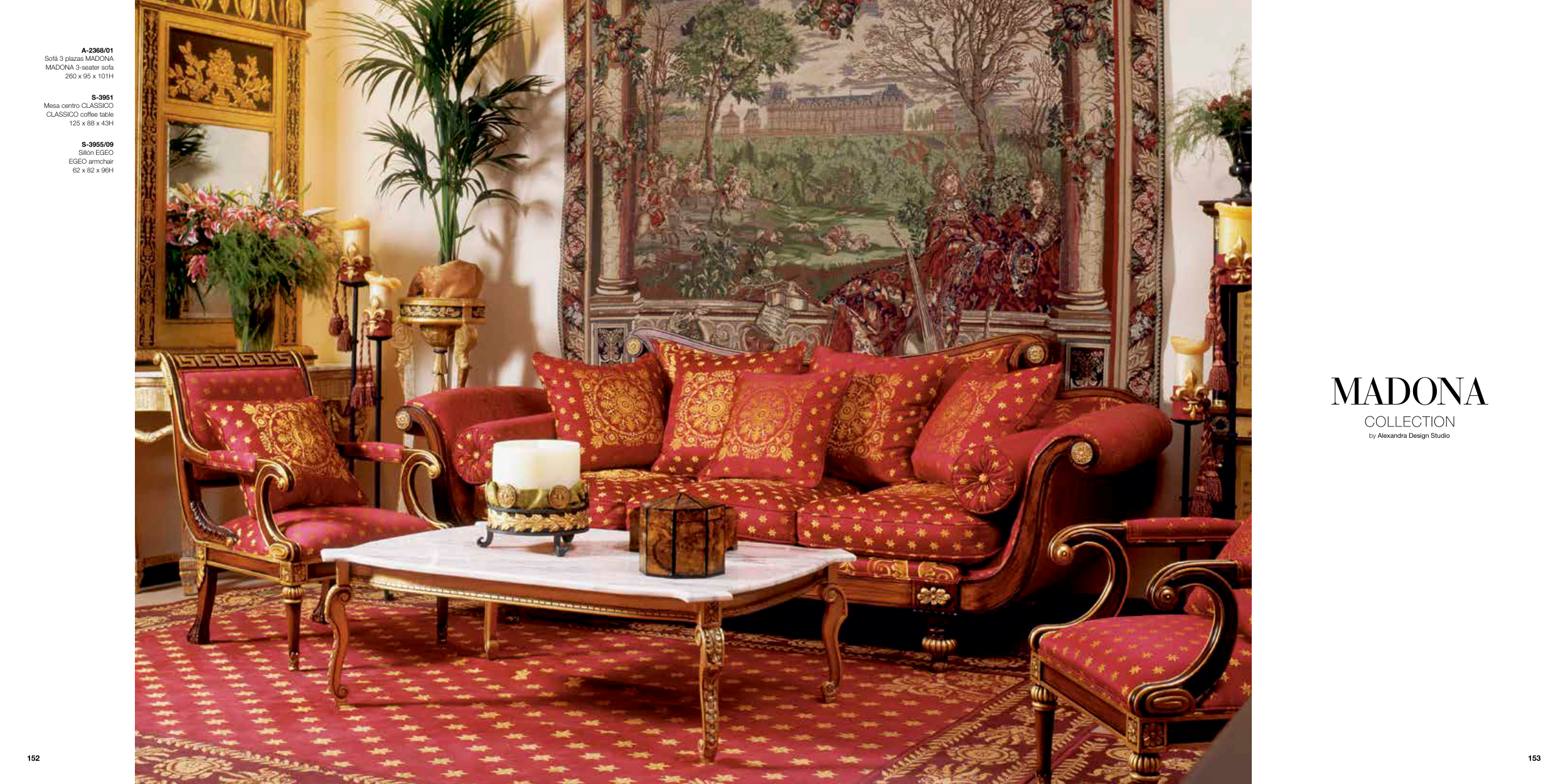 MADONA by Alexandra Design Studio A-2368/01 Sofá 3 plazas MADONA MADONA 3-seater sofa 260 x 95 x 101H S-3951 Mesa centro CLASSICO CLASSICO coffee table 125 x 88 x 43H S-3955/09 Sillón EGEO EGEO armchair 62 x 82 x 96H 153 152