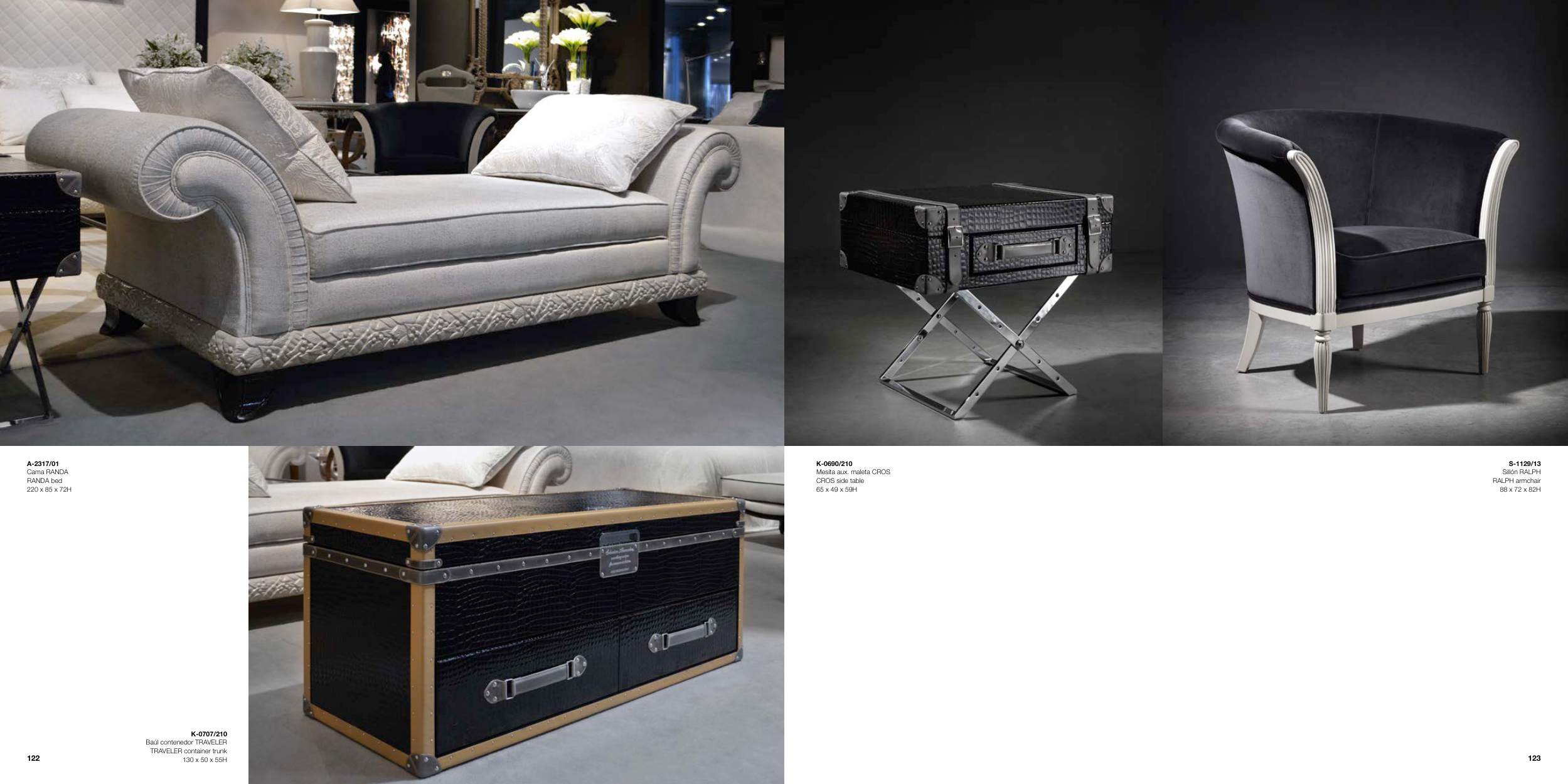 S-1129/13 Sillón RALPH RALPH armchair 88 x 72 x 82H K-0690/210 Mesita aux. maleta CROS CROS side table 65 x 49 x 59H K-0707/210 Baúl contenedor TRAVELER TRAVELER container trunk 130 x 50 x 55H A-2317/01 Cama RANDA RANDA bed 220 x 85 x 72H 123 122
