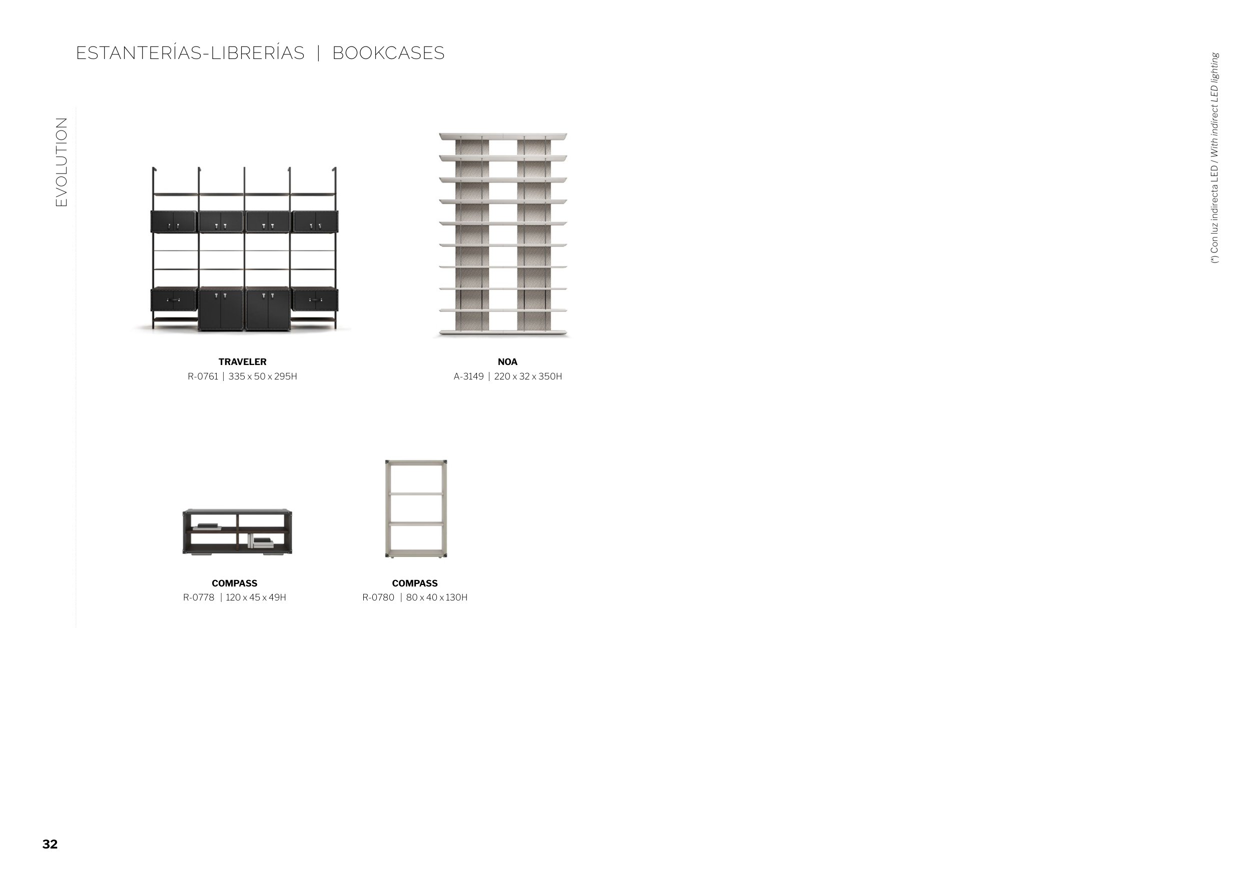 ESTANTERÍAS-LIBRERÍAS | BOOKCASES COMPASS R-0778 | 120 x 45 x 49H COMPASS R-0780 | 80 x 40 x 130H (*) Con luz indirecta LED / With indirect LED lighting EVOLUTION TRAVELER R-0761 | 335 x 50 x 295H NOA A-3149 | 220 x 32 x 350H 32