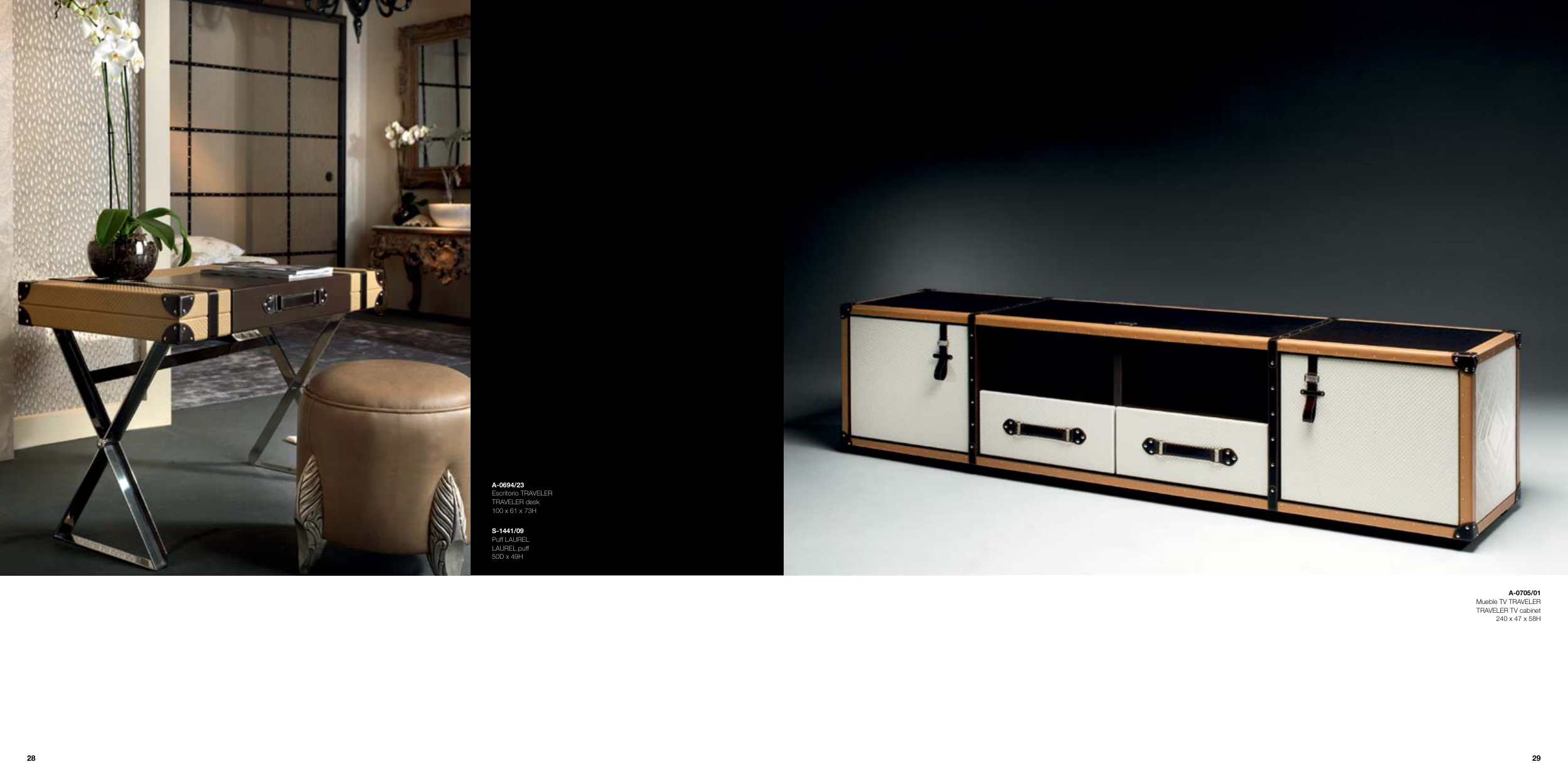 A-0705/01 Mueble TV TRAVELER TRAVELER TV cabinet 240 x 47 x 58H A-0694/23 Escritorio TRAVELER TRAVELER desk 100 x 61 x 73H S-1441/09 Puff LAUREL LAUREL puff 50D x 49H 29 28