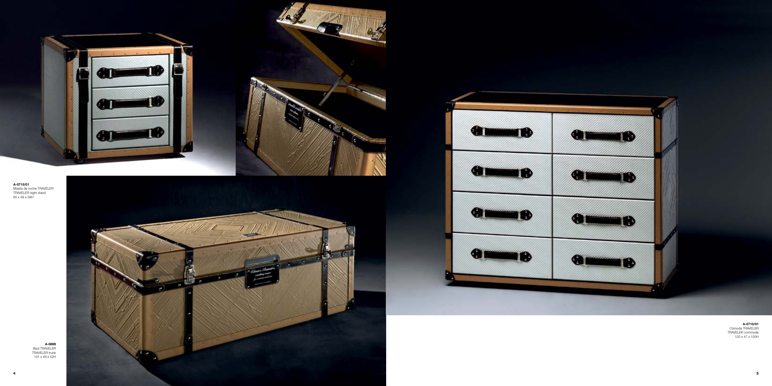P-2058 Pantalla pinza interior dorado Gold inside lamp shade 14D A-0715/01 Mesita de noche TRAVELER TRAVELER night stand 65 x 49 x 59H A-0710/01 Cómoda TRAVELER TRAVELER commode 120 x 47 x 105H A-0699 Baúl TRAVELER TRAVELER trunk 101 x 48 x 42H 5 4