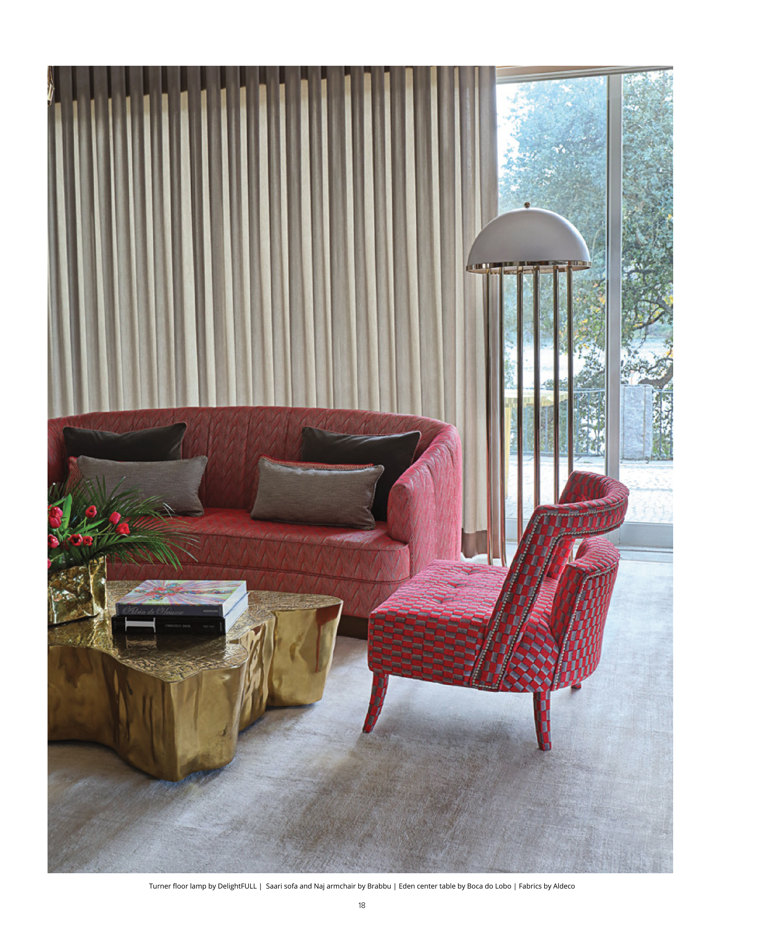 Turner floor lamp by DelightFULL | Saari sofa and Naj armchair by Brabbu | Eden center table by Boca do Lobo | Fabrics by Aldeco