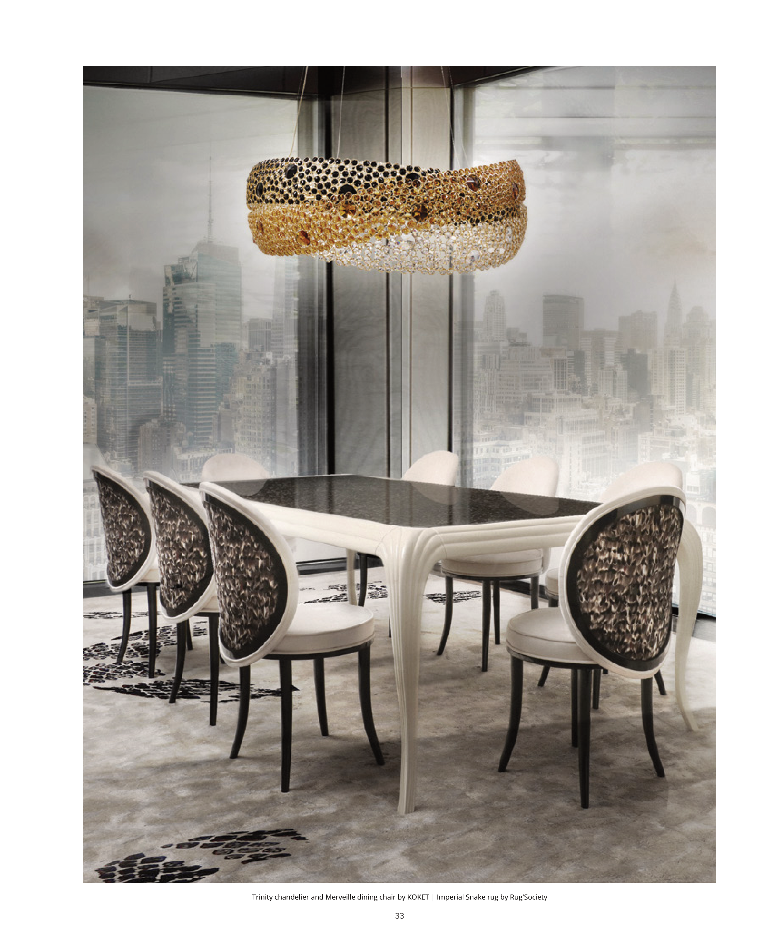 Trinity chandelier and Merveille dining chair by KOKET | Imperial Snake rug by Rug'Society