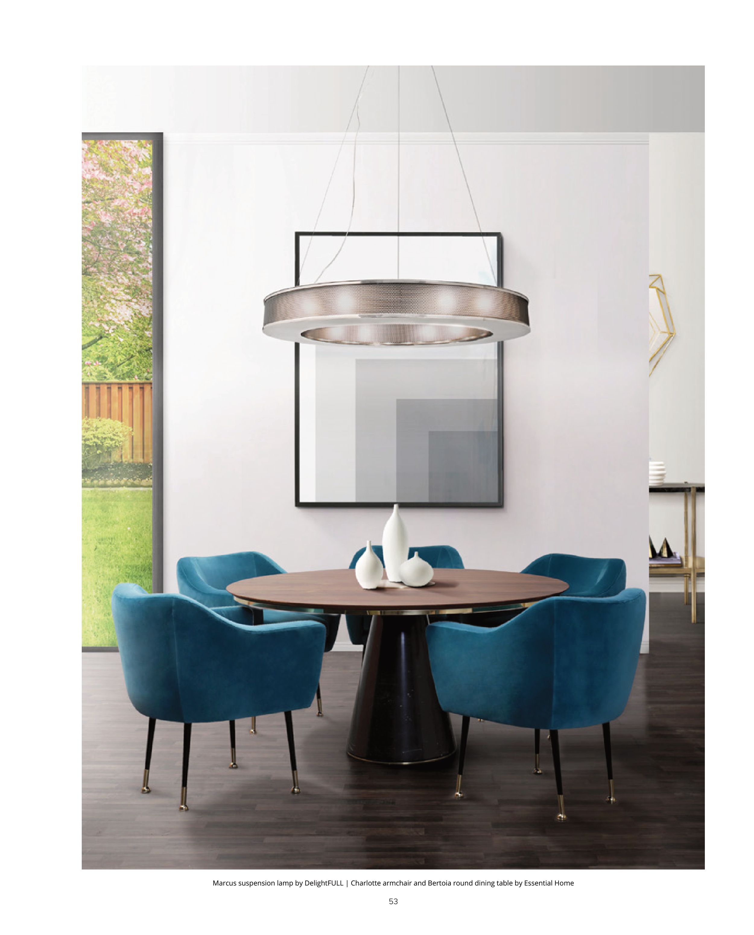 Marcus suspension lamp by DelightFULL | Charlotte armchair and Bertoia round dining table by Essential Home