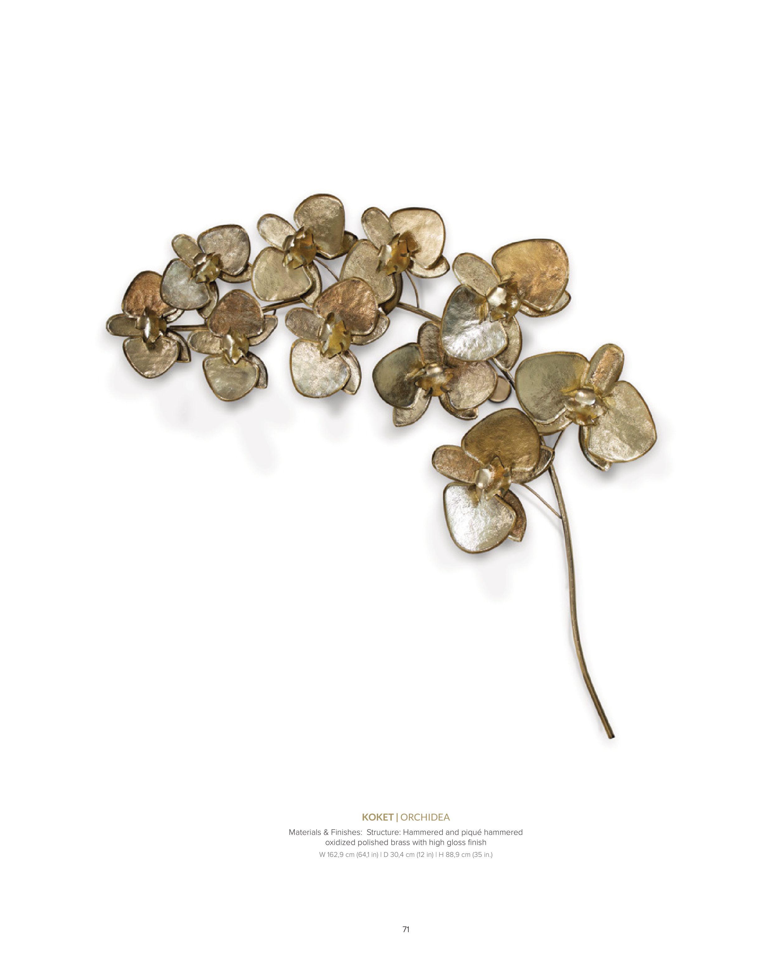 71 KOKET | ORCHIDEA Materials & Finishes: Structure: Hammered and piqué hammered oxidized polished brass with high gloss finish W 162,9 cm (64,1 in) | D 30,4 cm (12 in) | H 88,9 cm (35 in.)