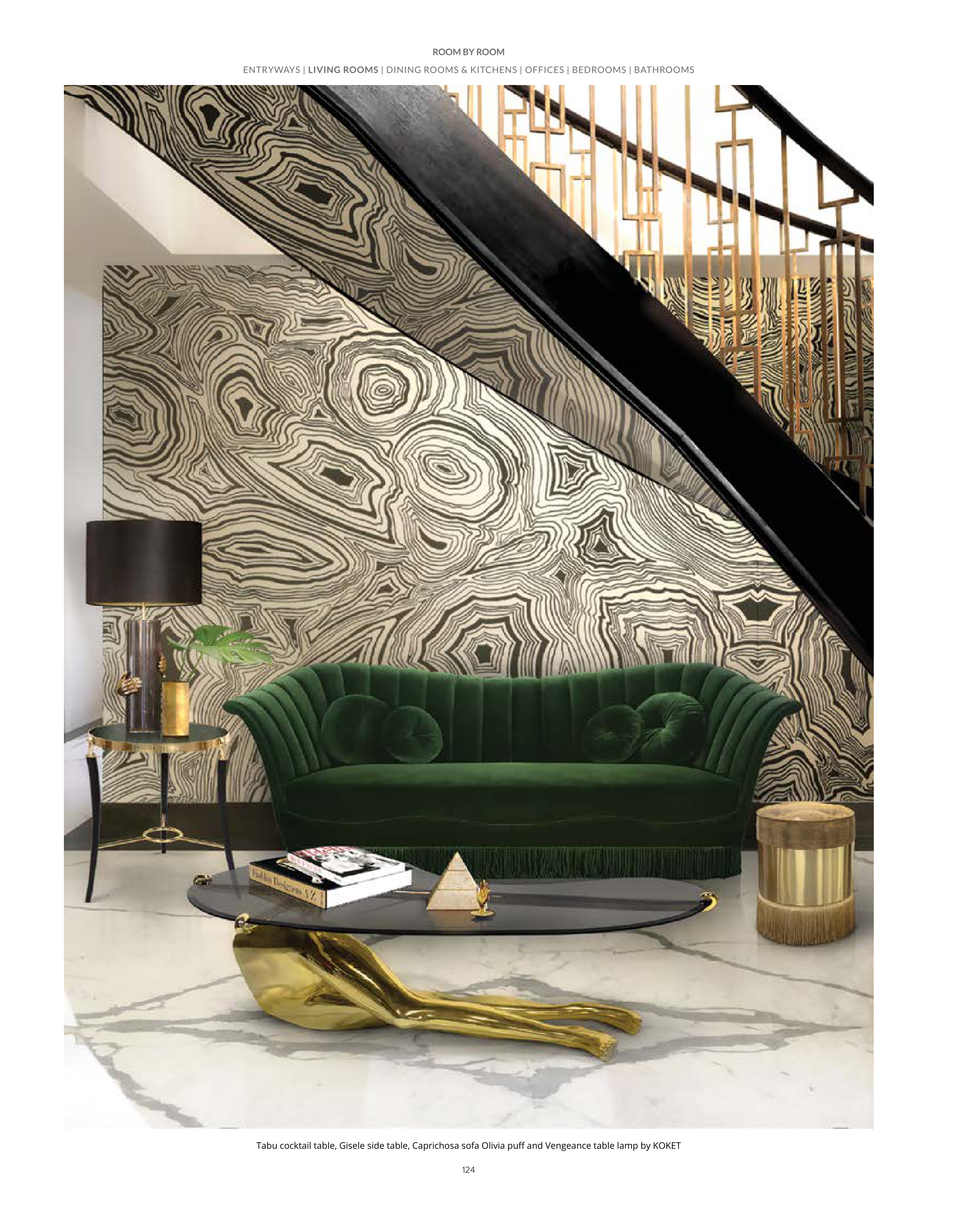 Tabu cocktail table, Gisele side table, Caprichosa sofa Olivia puff and Vengeance table lamp by KOKET