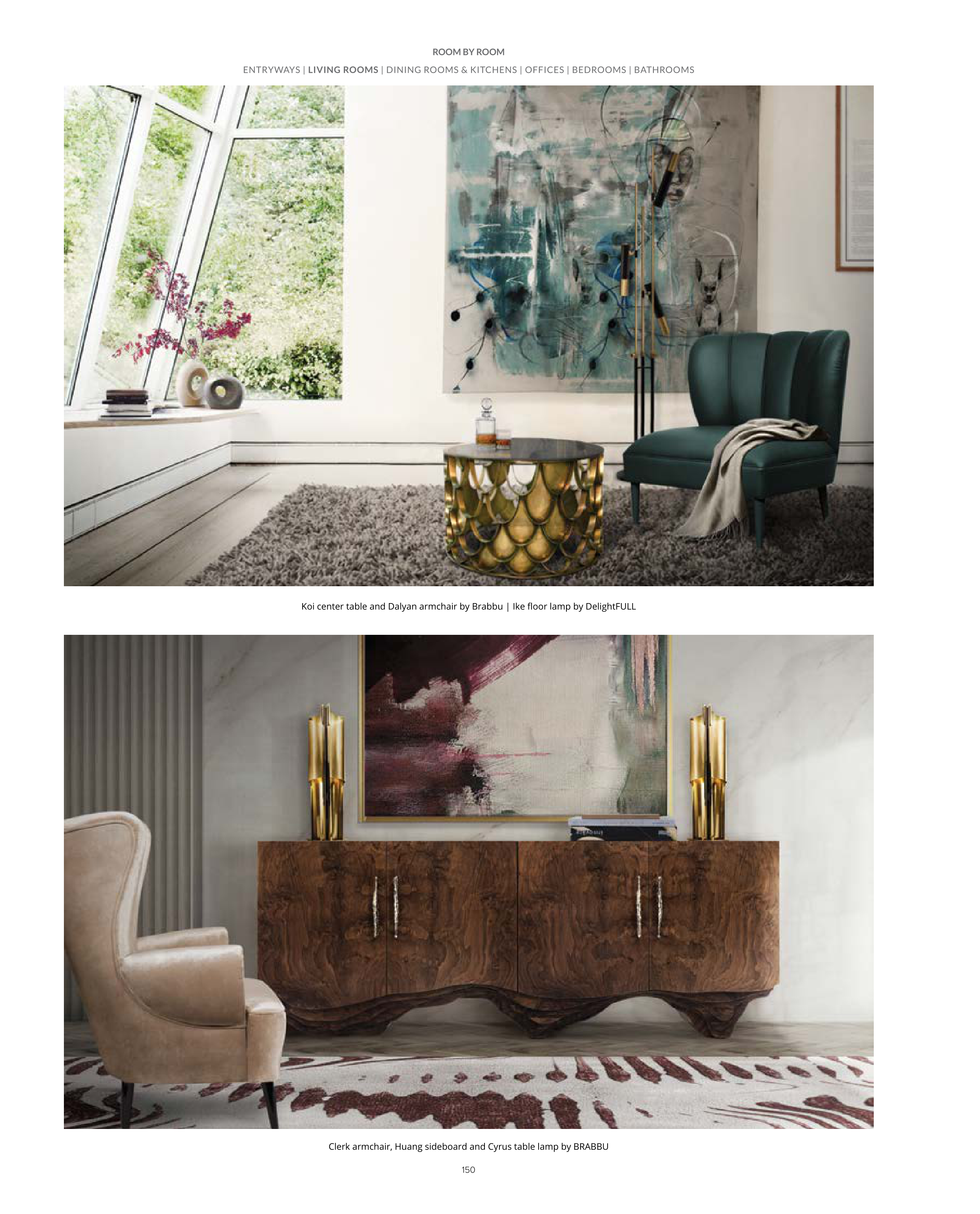 150 Koi center table and Dalyan armchair by Brabbu | Ike floor lamp by DelightFULL Clerk armchair, Huang sideboard and Cyrus table lamp by BRABBU ENTRYWAYS | LIVING ROOMS | DINING ROOMS & KITCHENS | OFFICES | BEDROOMS | BATHROOMS ROOM BY ROOM