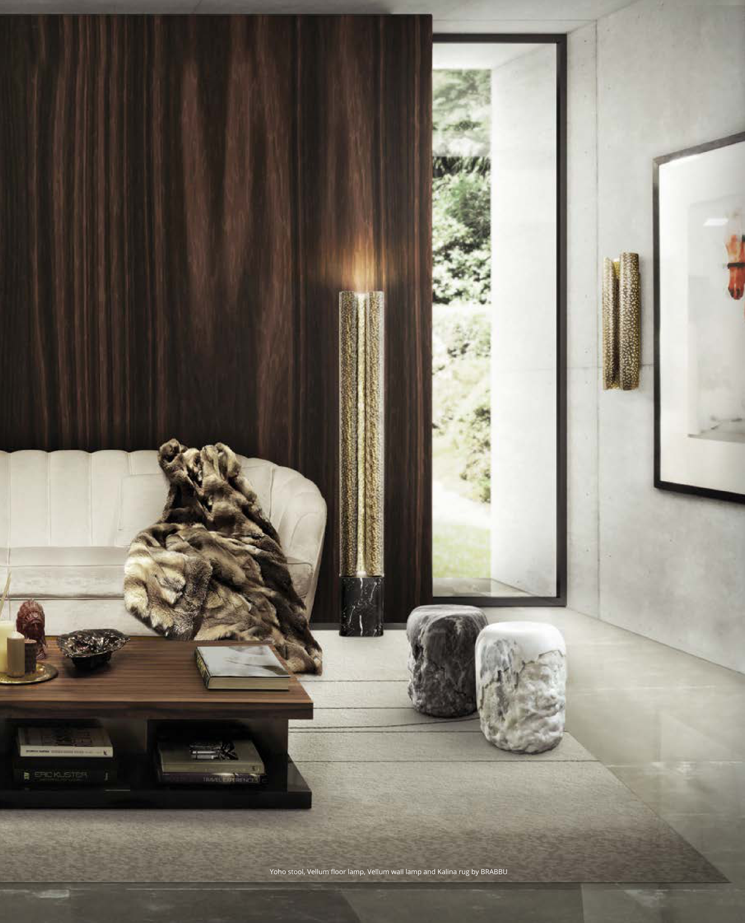Yoho stool, Vellum floor lamp, Vellum wall lamp and Kalina rug by BRABBU