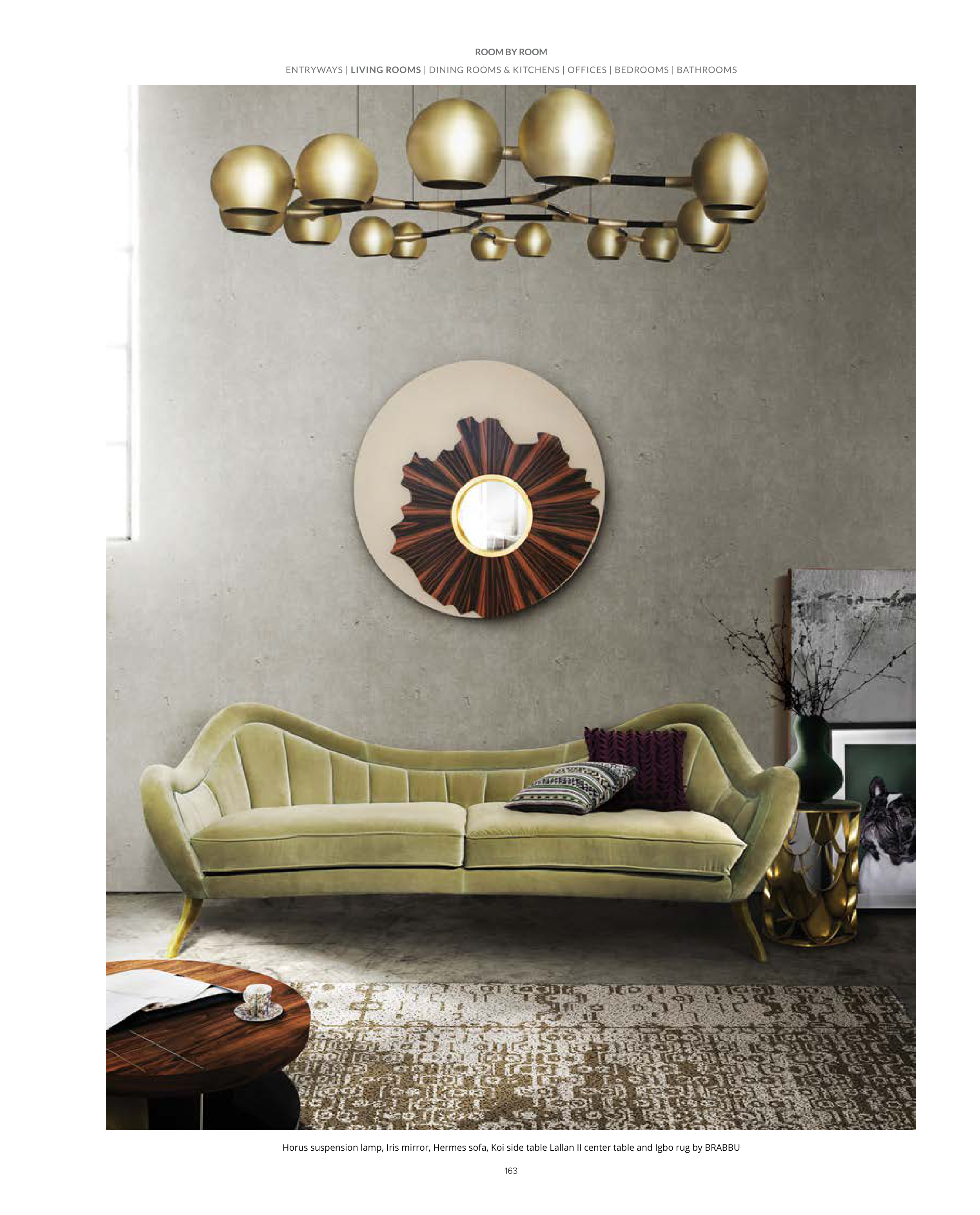 163 Horus suspension lamp, Iris mirror, Hermes sofa, Koi side table Lallan II center table and Igbo rug by BRABBU ENTRYWAYS | LIVING ROOMS | DINING ROOMS & KITCHENS | OFFICES | BEDROOMS | BATHROOMS ROOM BY ROOM