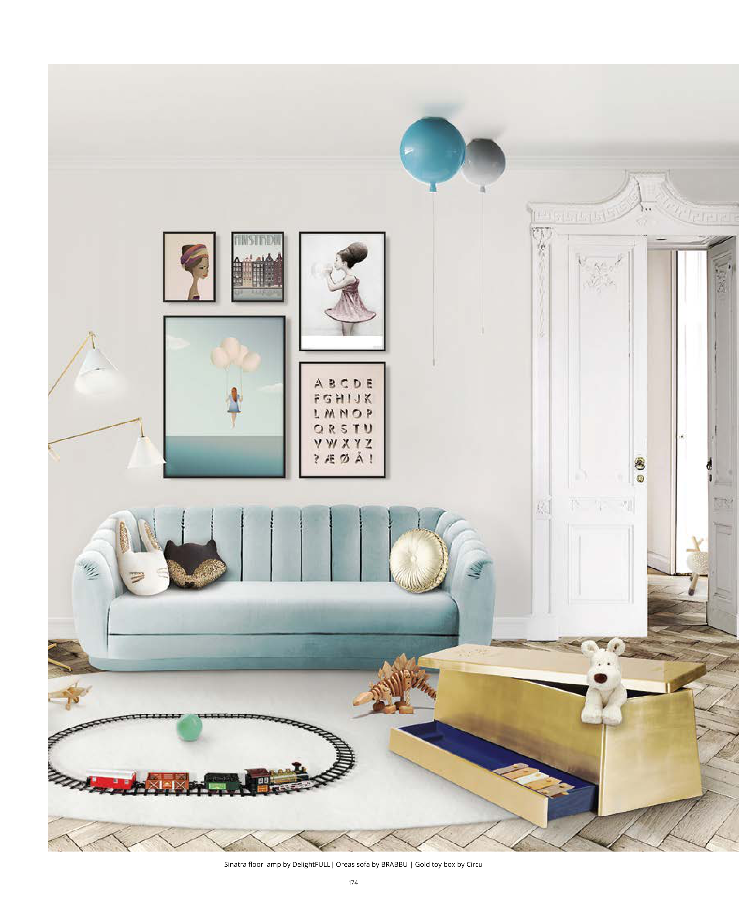 Sinatra floor lamp by DelightFULL| Oreas sofa by BRABBU | Gold toy box by Circu