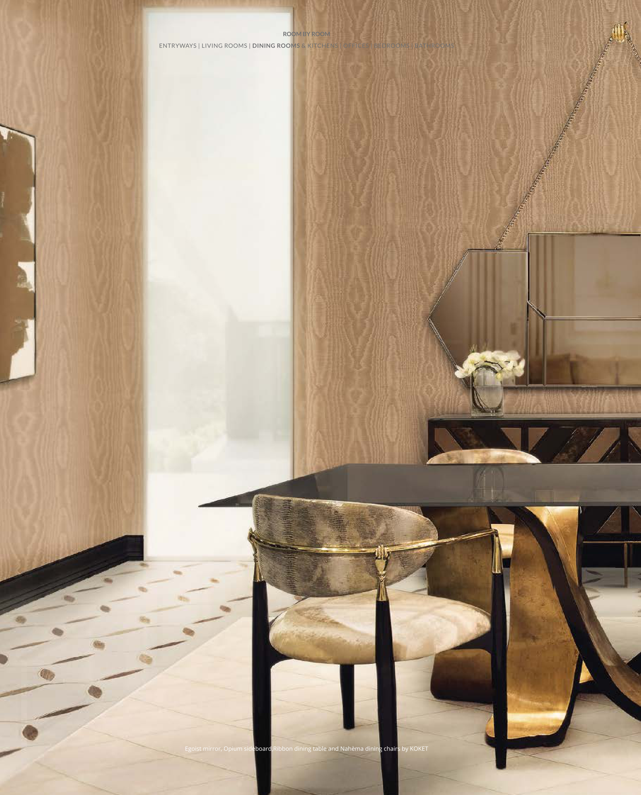 Egoist mirror, Opium sideboard,Ribbon dining table and Nahèma dining chairs by KOKET