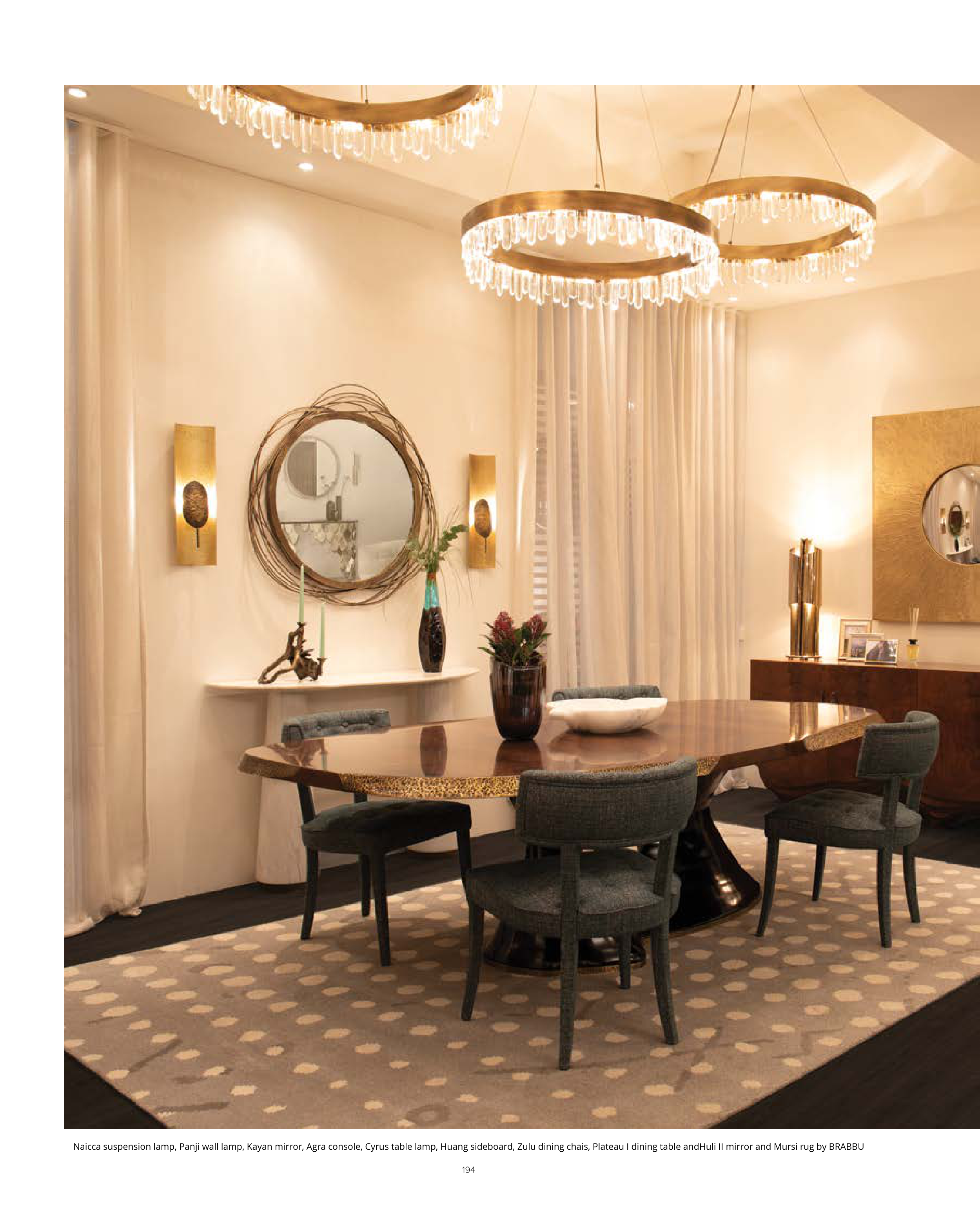 Naicca suspension lamp, Panji wall lamp, Kayan mirror, Agra console, Cyrus table lamp, Huang sideboard, Zulu dining chais, Plateau I dining table andHuli II mirror and Mursi rug by BRABBU
