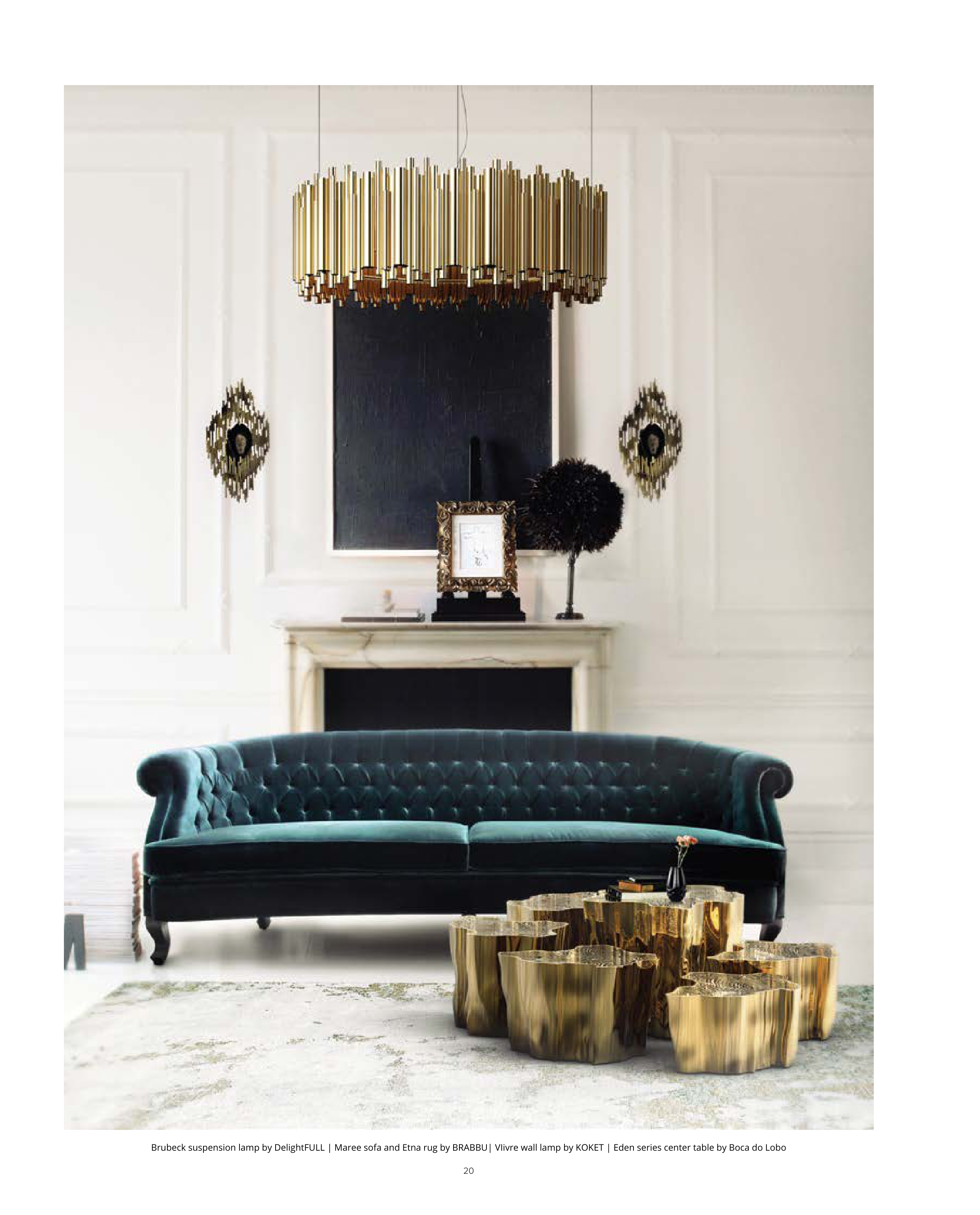 Brubeck suspension lamp by DelightFULL | Maree sofa and Etna rug by BRABBU| VIivre wall lamp by KOKET | Eden series center table by Boca do Lobo