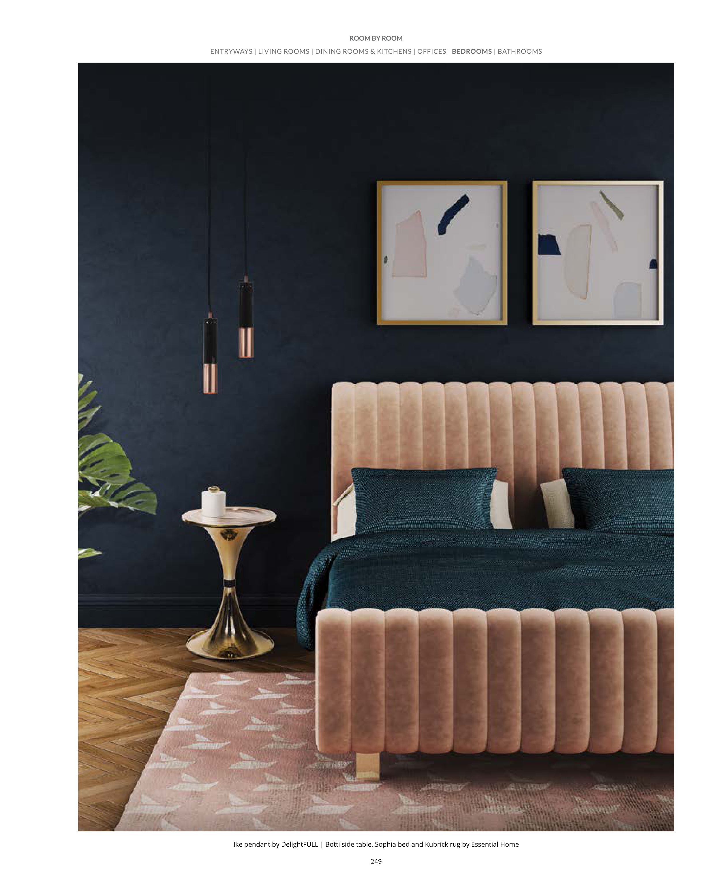 249 Ike pendant by DelightFULL | Botti side table, Sophia bed and Kubrick rug by Essential Home ENTRYWAYS | LIVING ROOMS | DINING ROOMS & KITCHENS | OFFICES | BEDROOMS | BATHROOMS ROOM BY ROOM