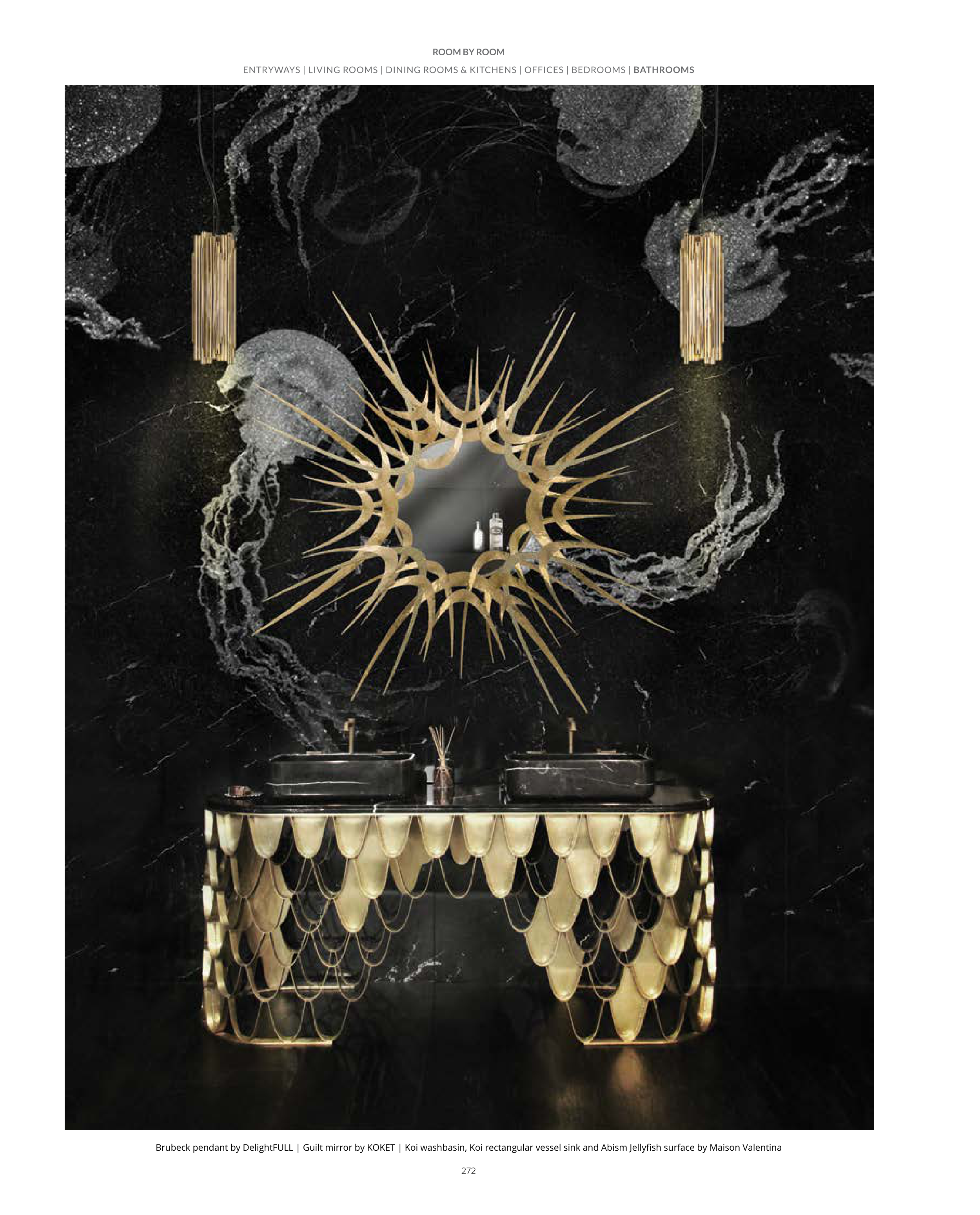 Brubeck pendant by DelightFULL | Guilt mirror by KOKET | Koi washbasin, Koi rectangular vessel sink and Abism Jellyfish surface by Maison Valentina